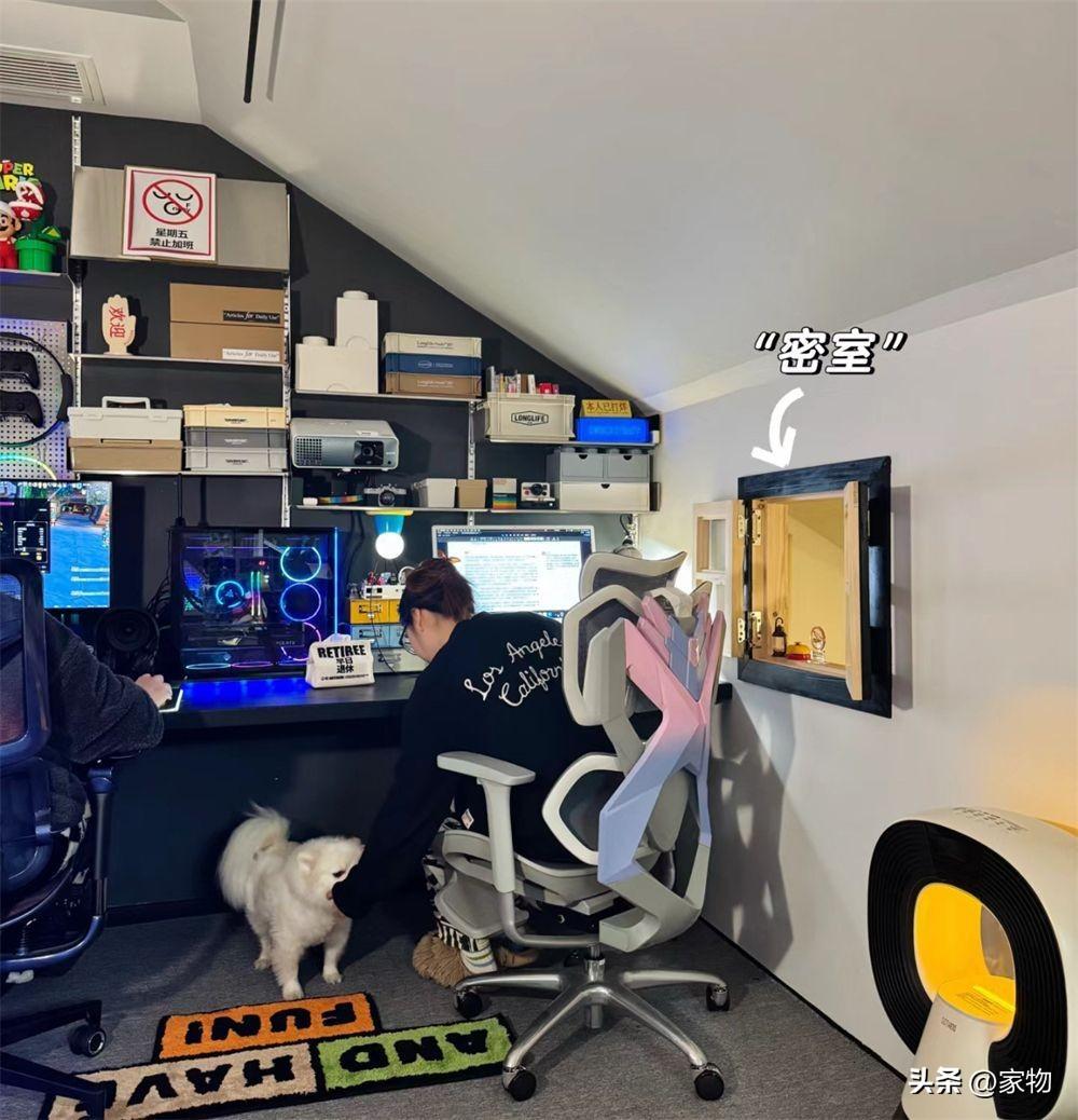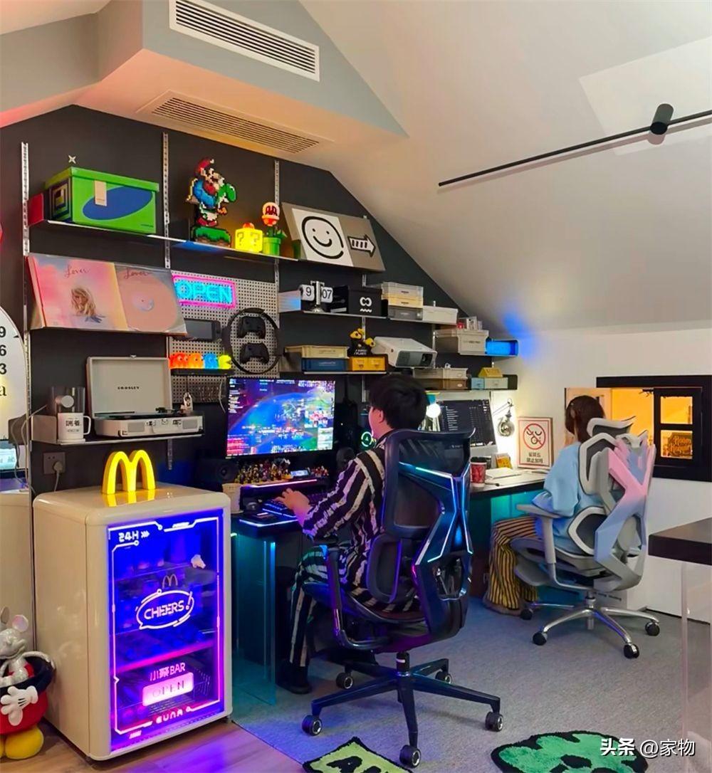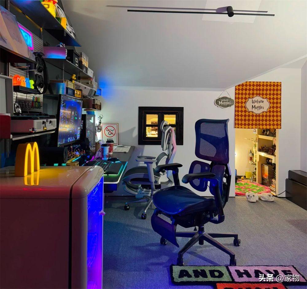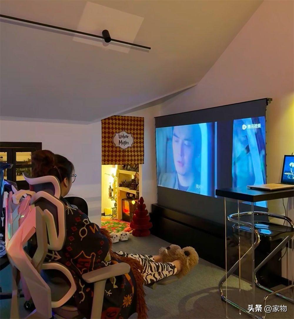 而電競房的背面,高度正好夠放一面幕布牆,坐在這裏看看電影,追追劇,真的要多舒服有多舒服,即便閣樓斜頂有一部分較爲低矮,也完全不會影響到兩人正常使用。