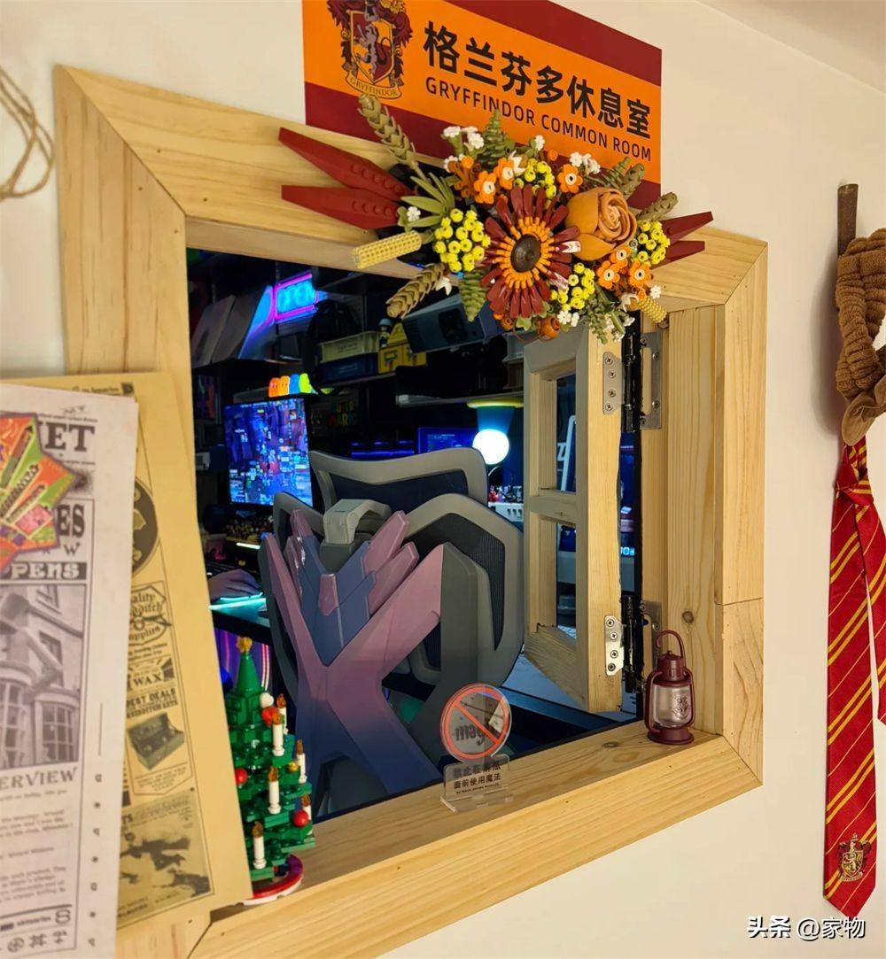 進入電競房的位置,也就是一上樓梯的走廊過道,做了一張方桌,它的作用既是展示“霍格沃茲城堡”的樂高擺件,又是一個臨時的置物區,放香薰、水杯等物都沒問題。
