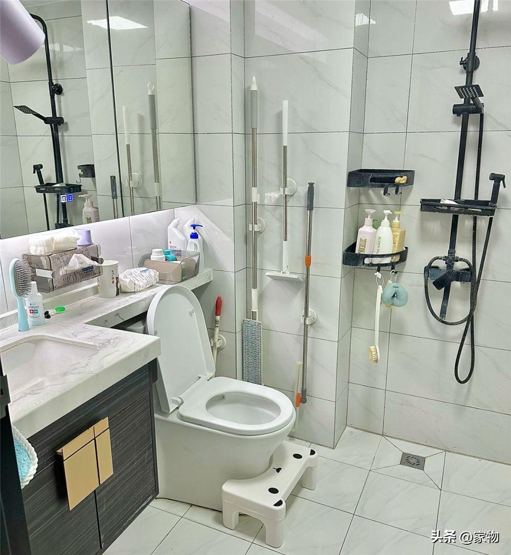 家裏的衛生間在玄關櫃正對面,是一間沒有窗戶的暗衛,但裏面洗漱、如廁、沐浴空間一應俱全,絲毫不會覺得不方便,尤其是這1米5長的大鏡櫃,收納洗漱清潔用品剛好合適。