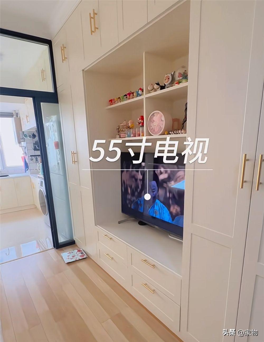 還記得剛一進門的大衣櫃嗎?它一直連通到了屋內的電視櫃,做成了類似滿牆電視櫃的效果。
