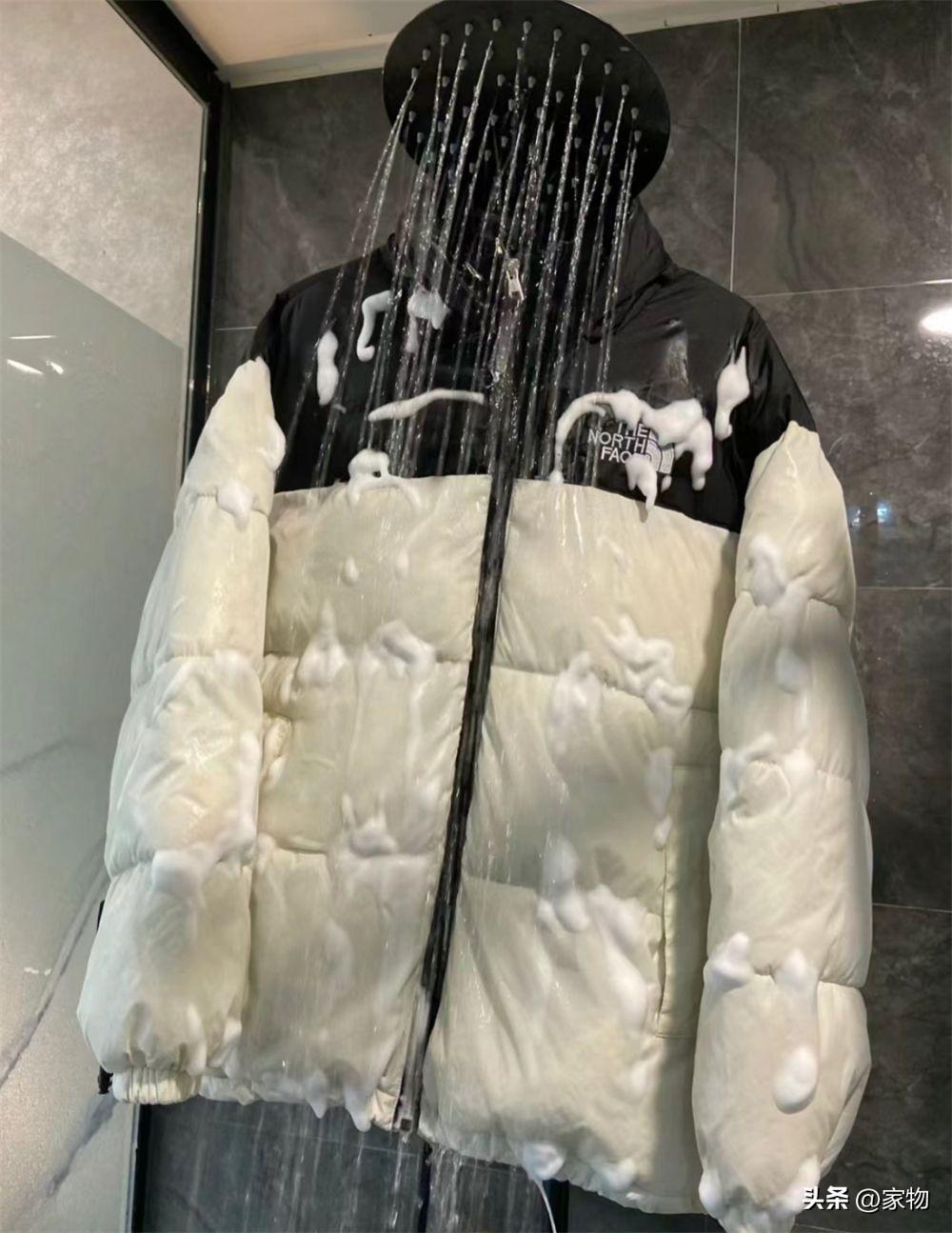 方法也簡單,就是把羽絨服掛在浴室的花灑上,用泡沫清潔劑塗滿浸潤後,再搓洗沖水,一來二去間,既保護了羽絨和麪料,又能快速清潔乾淨,真的太實用了。