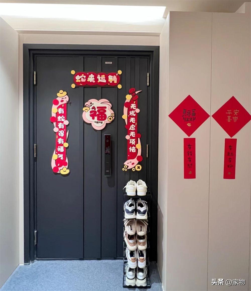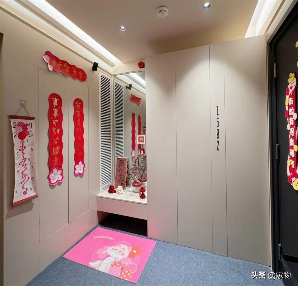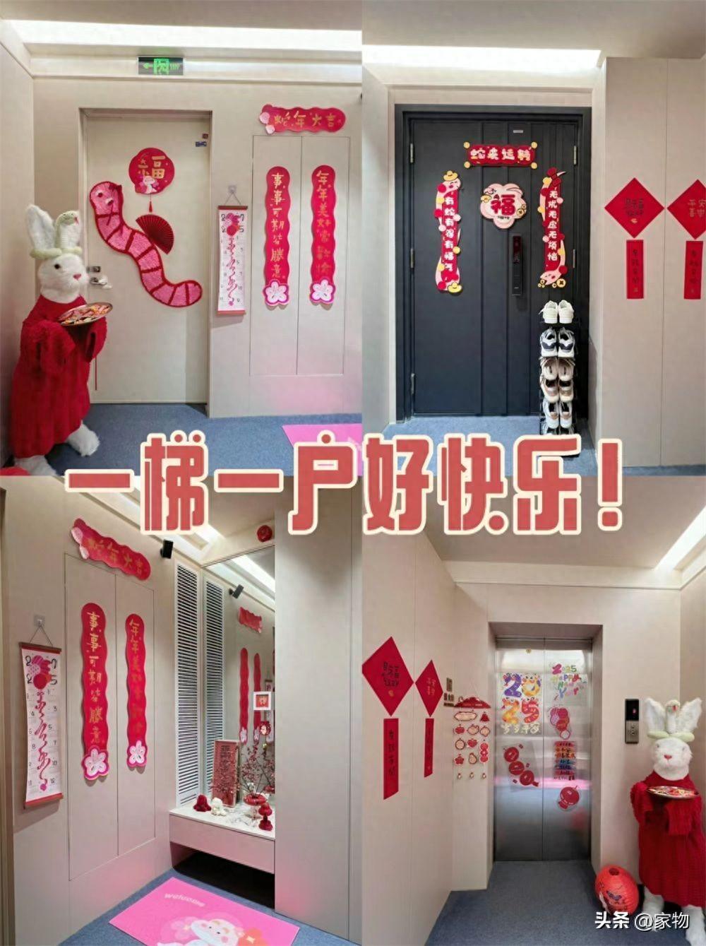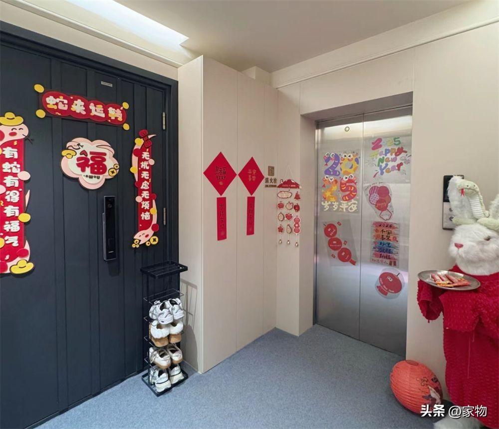 旁邊的樓梯間門也進行了更換,將門扇做成和電梯間櫃體牆面同色系的,並在上面掛了福字、貼了掛毯裝飾,完全按照室內裝修的規格進行佈置。