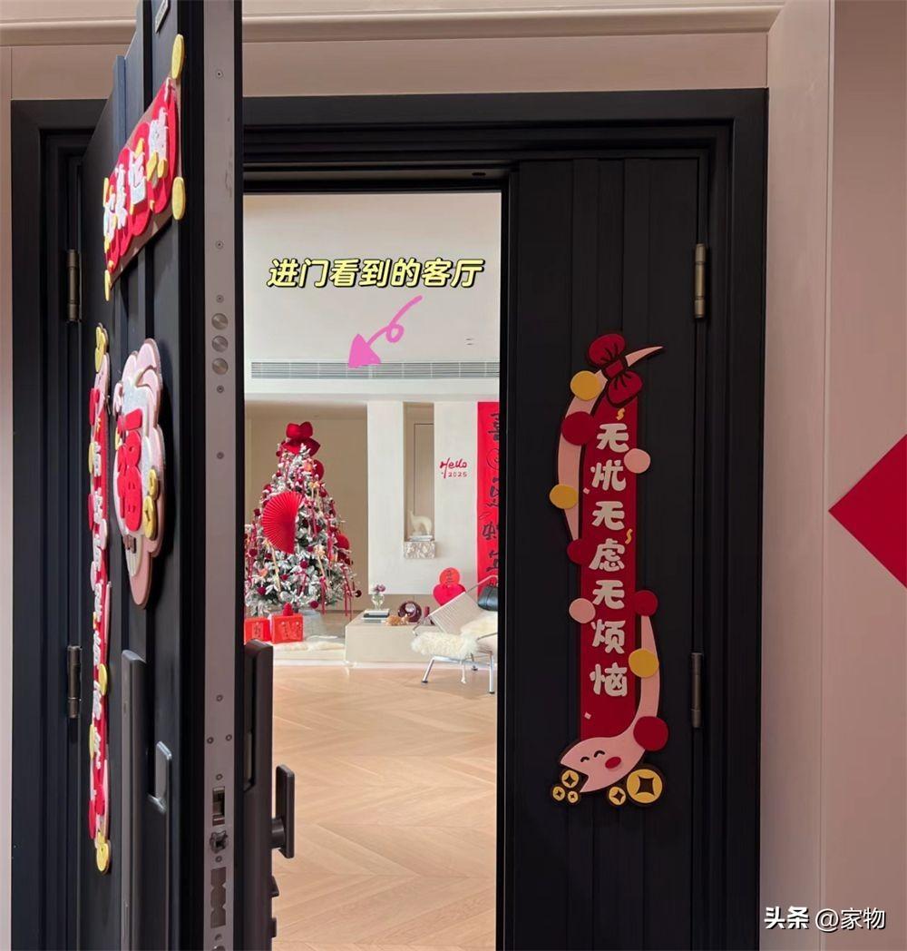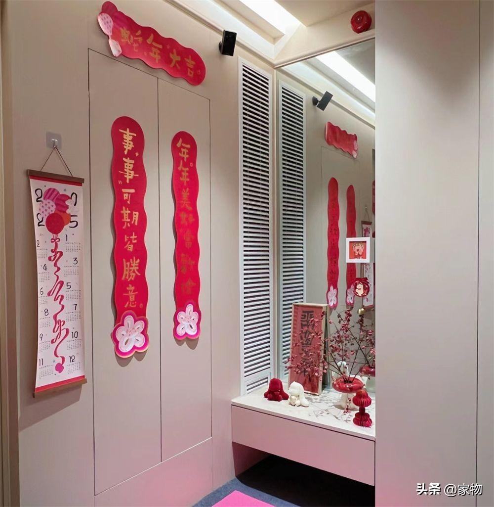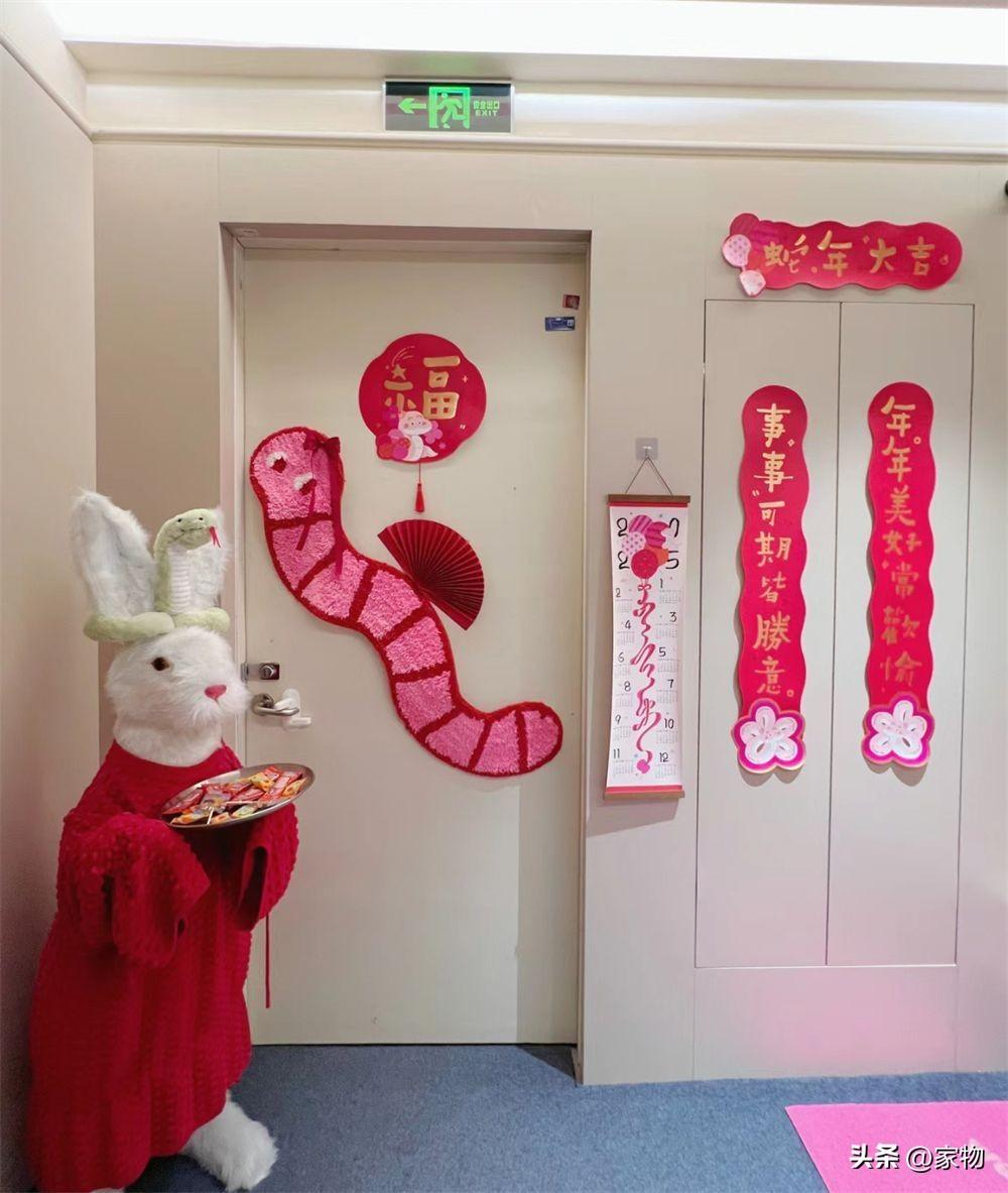 旁邊的樓梯間門也進行了更換,將門扇做成和電梯間櫃體牆面同色系的,並在上面掛了福字、貼了掛毯裝飾,完全按照室內裝修的規格進行佈置。