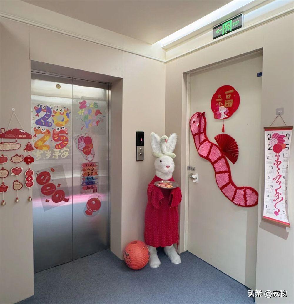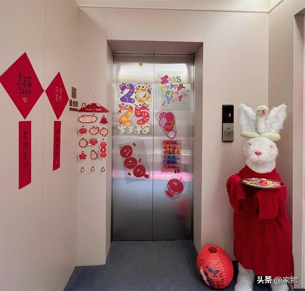 電梯外門,貼上一些貼畫進行裝飾,很有春節喜慶的氣息。