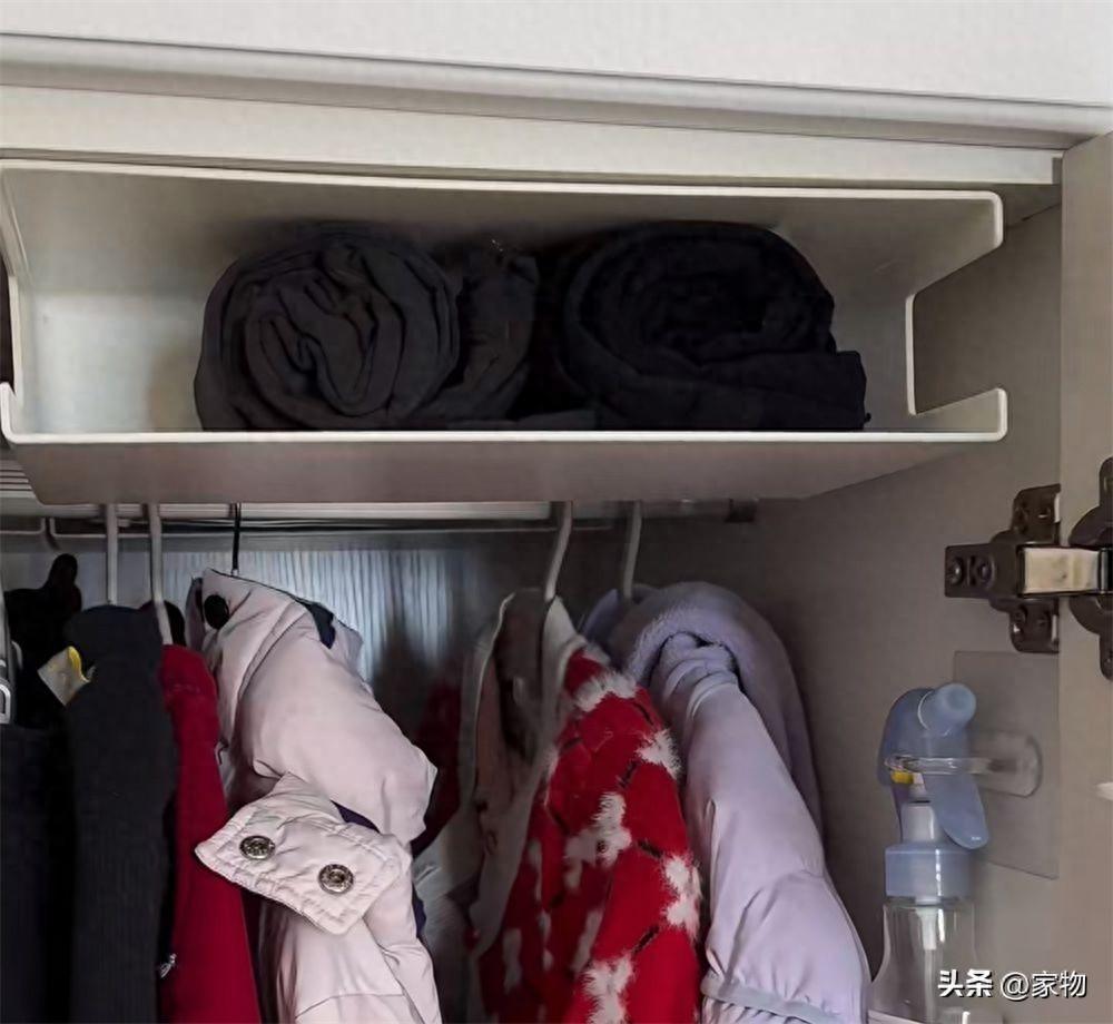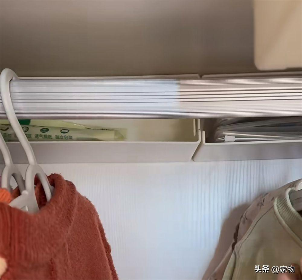掛杆後面的收納盒,則放一些不常拿取的物件,比如家裏的各種證件、香薰樟腦丸一類的物品,完全是利用冗餘雞肋空間進行收納,既省地兒,拿取起來又非常方便。