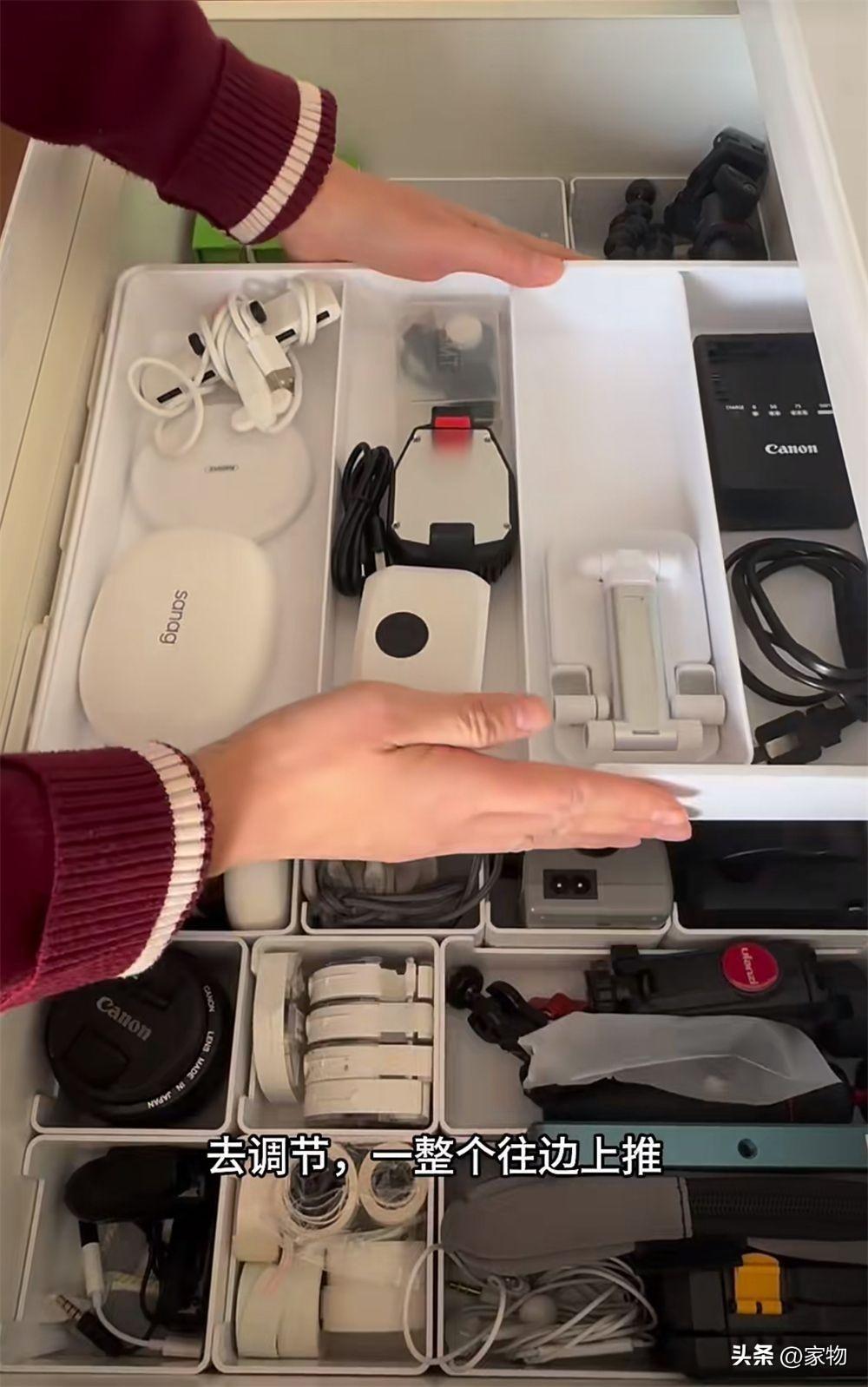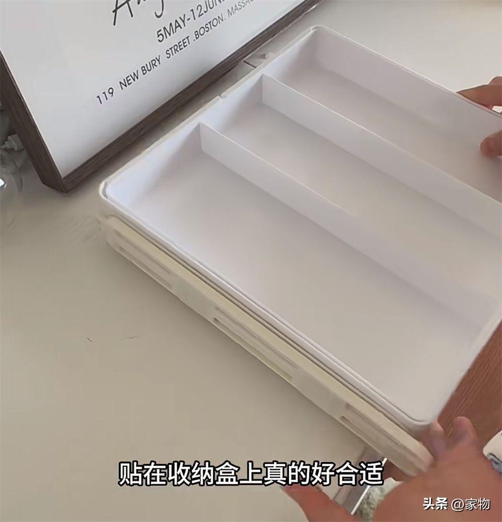 直接用滑軌貼在收納盒上,再齊平表面高度後貼到抽屜兩側,就變成了一個可以上下推動的靈活收納格,方便收納不同的小件雜物,放書桌裏收納充電線尤爲合適。
