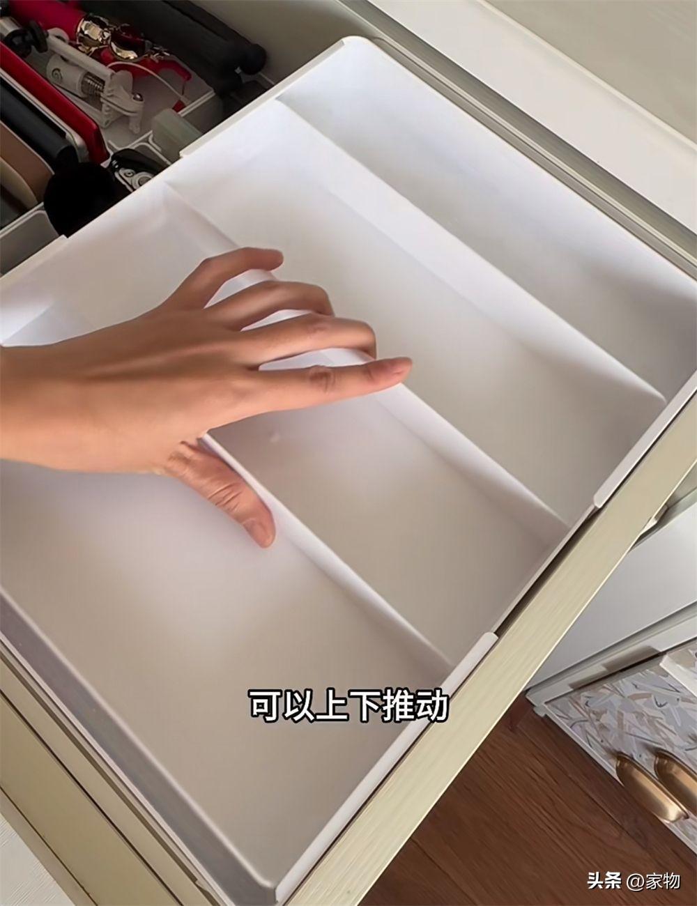 而滑軌的作用,更是方便它左右移動,將抽屜分成了上下兩層的收納空間,不僅收納翻了1.5倍,更是讓抽屜裏有條理了很多,我個人真推薦大家試試,簡直是腦洞大開的收納法~