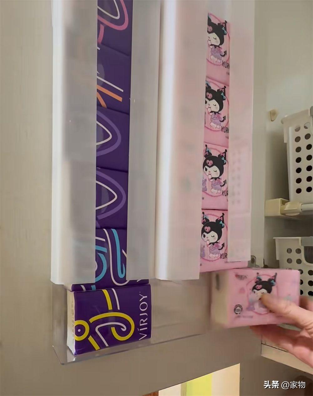 衛生間和玄關櫃的後面都可以貼,組合起來以後,大包小包紙巾都可以塞進去,拿最下面一包的時候,上面的紙巾就會落下來,有點像以前商店裏的口香糖盒子。