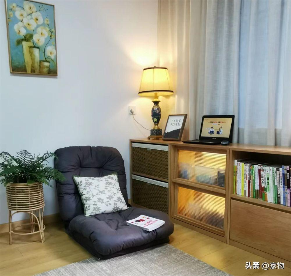 客廳角落中避開窗扇,在底部放上一排矮櫃,它們既是客廳的雜物收納櫃,同時也是一組書櫃,增加燈帶和檯燈照明後,坐在這裏看看書、休閒片刻,都能感覺頗爲舒適,沒有沙發影響也不算大。