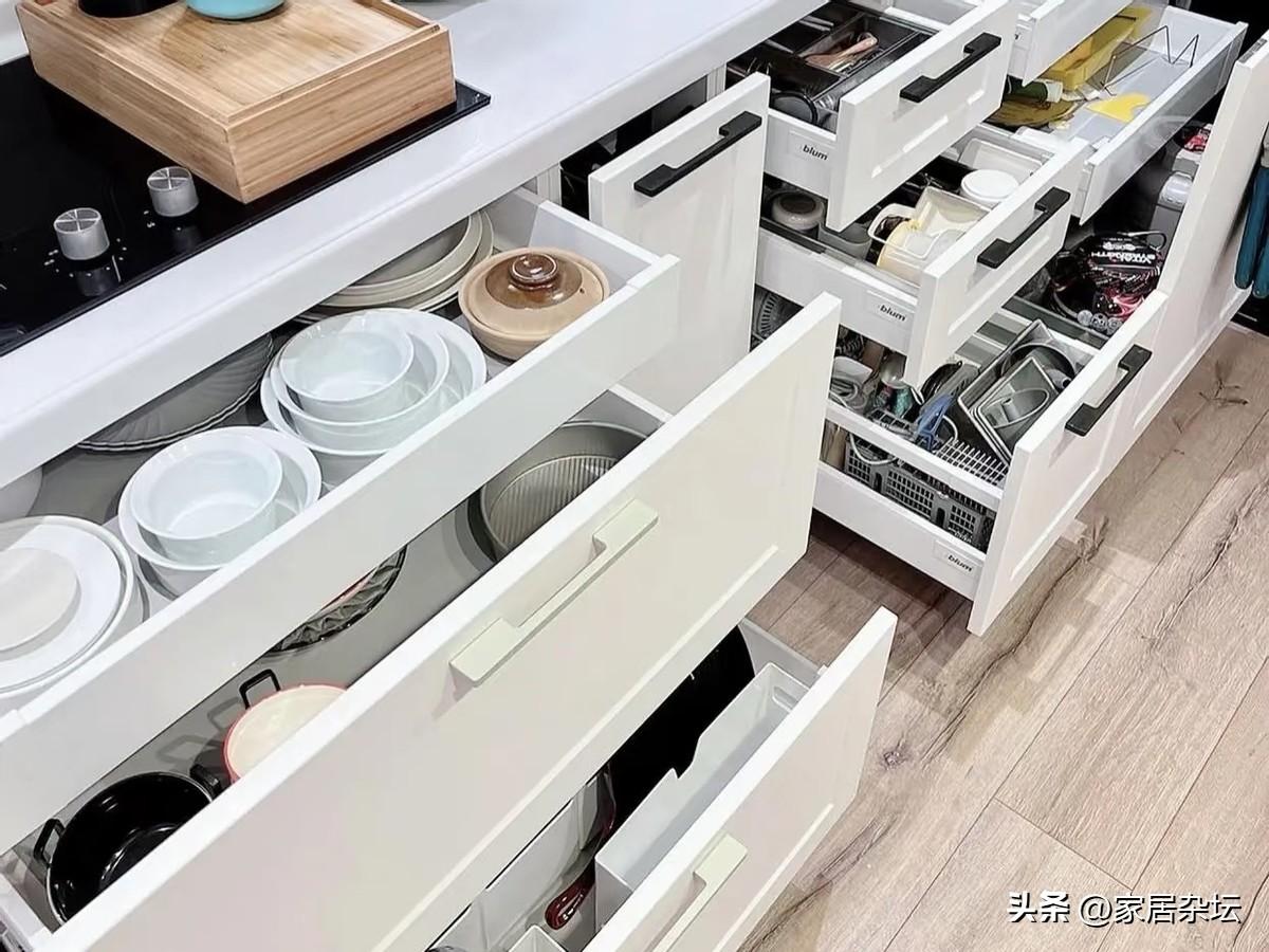 廚房的地櫃,建議大家能不做就不做,而是使用抽屜來代替。你會發現它的收納能力不僅是翻倍,而且幾乎廚房所有的東西幾乎都能收納進去。
