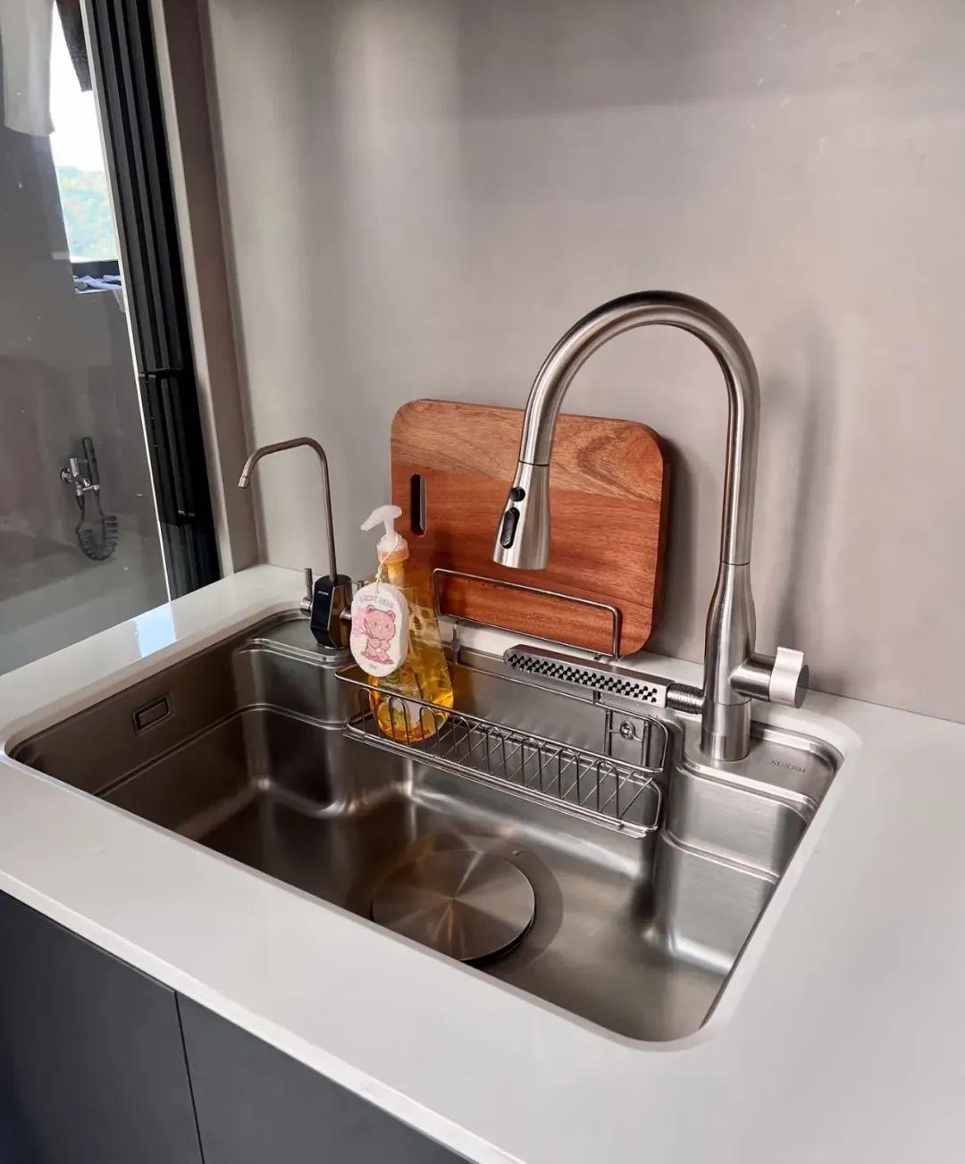 裝修廚房時,施工的師傅給了我兩個方案,一種是臺上盆,安裝簡單,放上臺面上打一圈膠水固定,優點是穩固、承重性好,容易更換;但是缺點是膠水後期都會發黴變黑,十分難看。還有一種就是我後來選擇做的下沉式水槽。