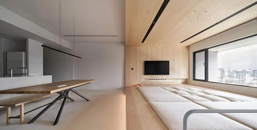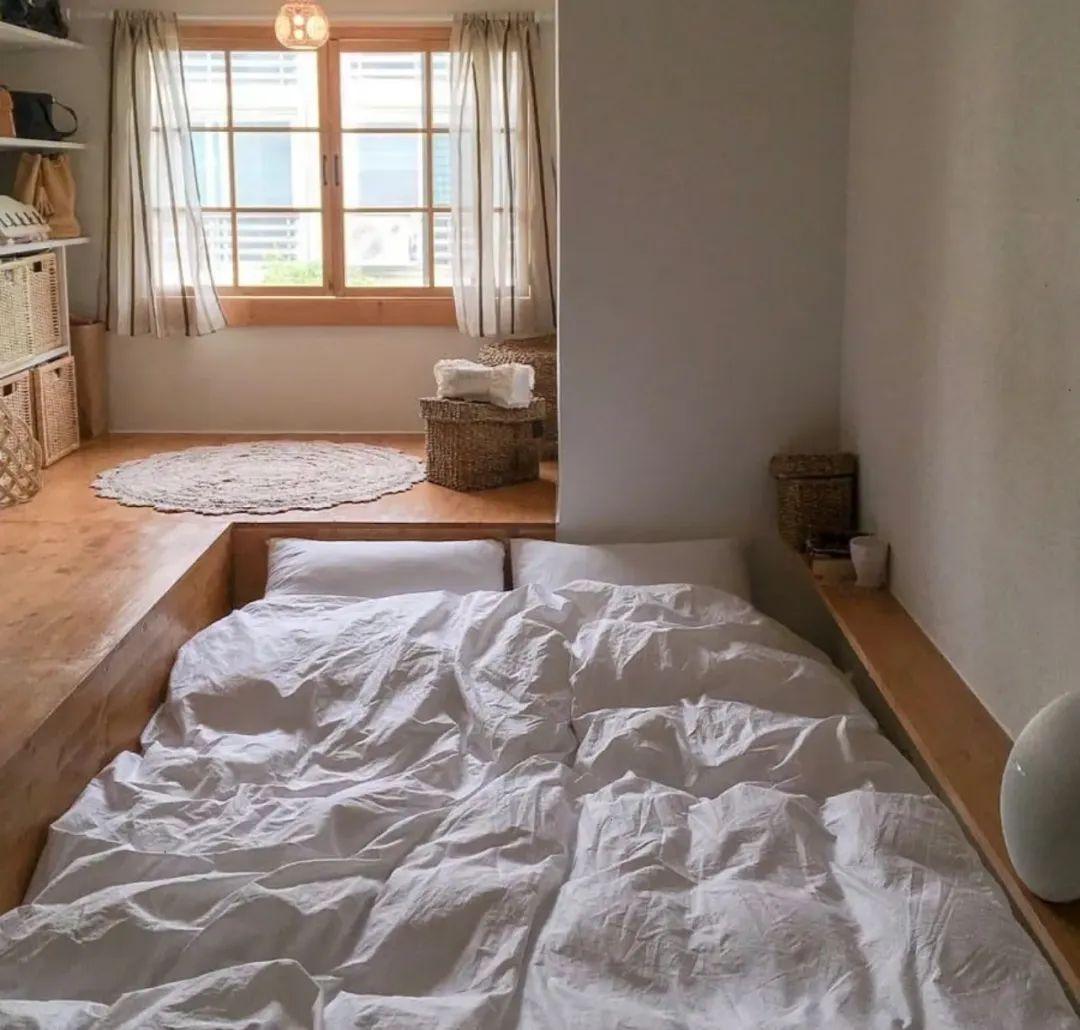 除了下沉式客廳,臥室也可以採取這種設計,方案異曲同工,找木工師傅在房間搭建地臺,不過這個地臺也可以做成榻榻米模式,雖然費用有所增加,但是同時也增加儲物空間。