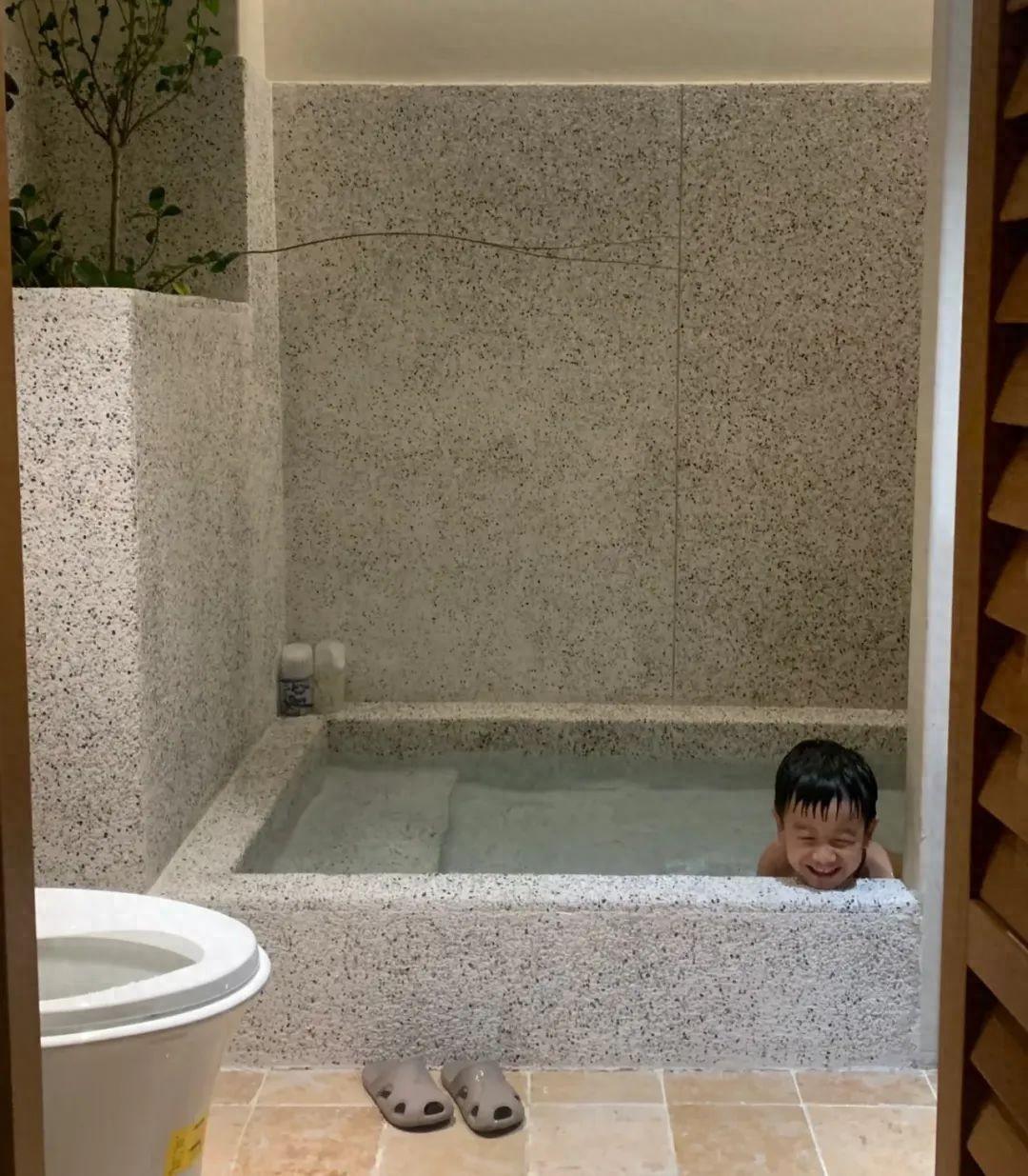 做法也不復雜,利用回填的深度,再砌高2-30公分做一個擋水板,浴缸表面可以用打磨過的水洗石,保留摩擦力防滑功能的同時也不會硌屁屁。