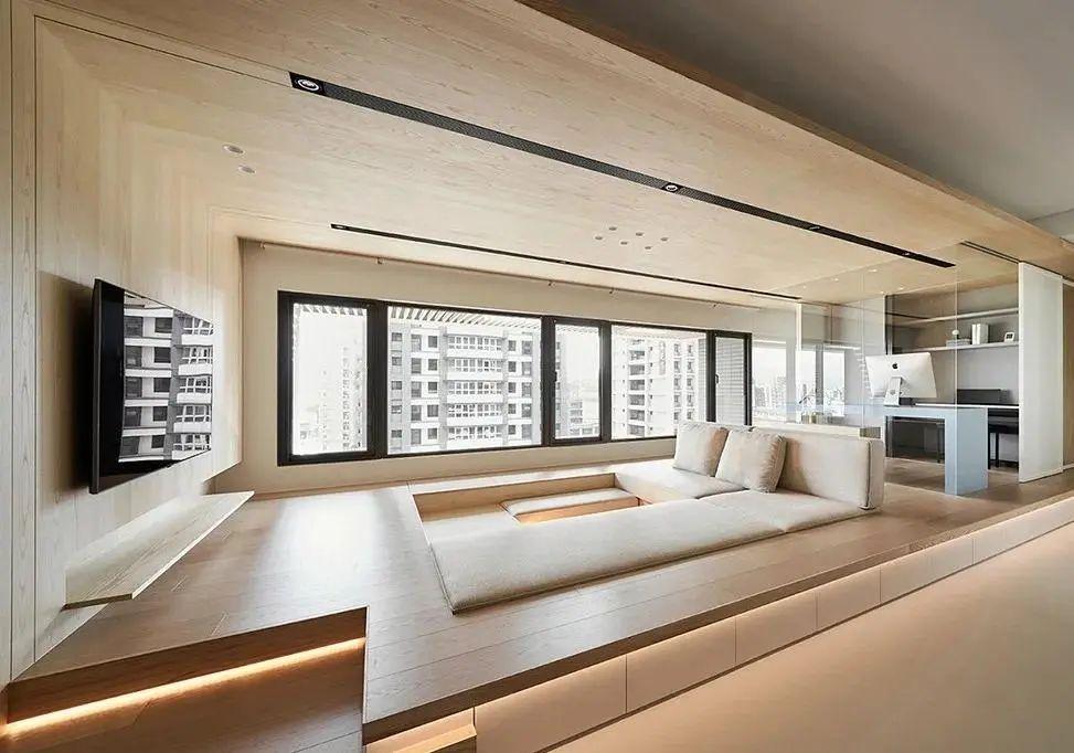 下沉式客廳並不是在地面挖坑,而是把周圍墊高,形成一塊獨特的客廳空間。最省錢的做法是讓木工師傅搭建一個地臺,中間區域留空,再鋪上和地臺同色的木地板。