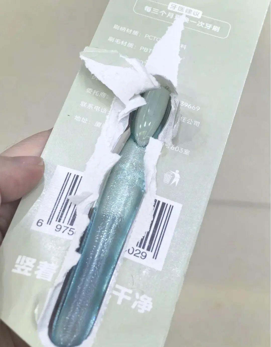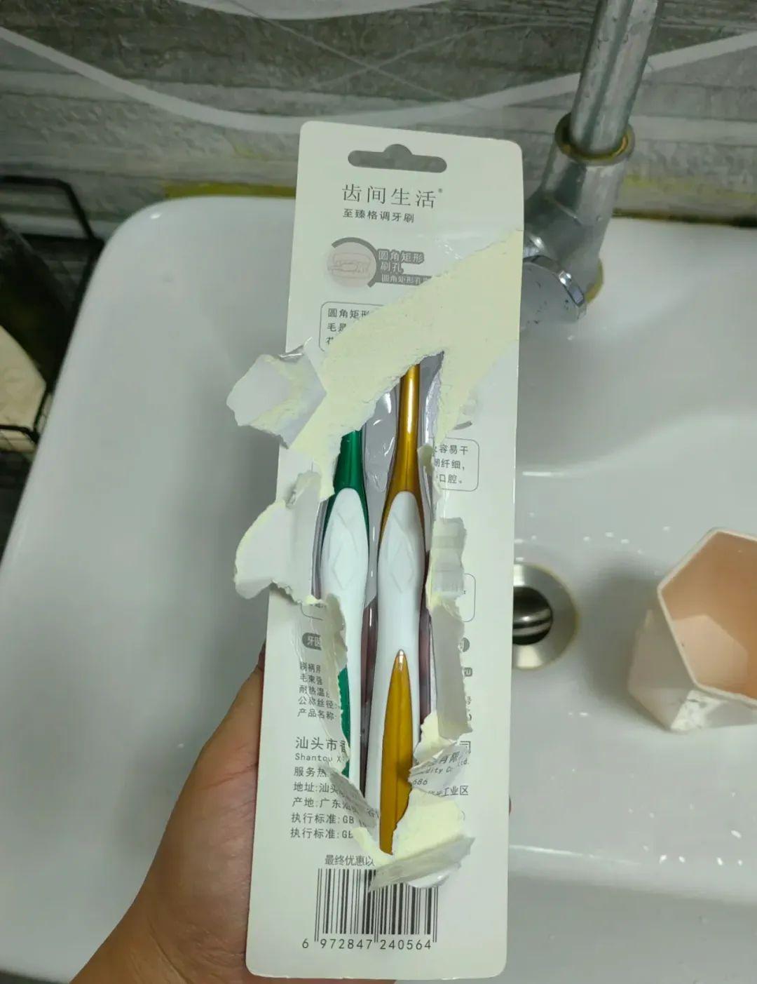 我從小就覺得牙刷包裝非常難撕開,背面硬卡紙上和正面透明泡殼牢牢黏在一起。這都過去多少年了,牙刷它還是這種包裝方式,每次都要撕成狗啃的一樣,真的鬱悶至極!