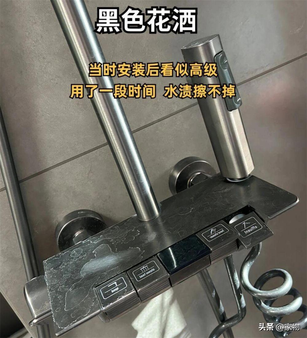 純黑色的花灑,看起來酷酷的,用起來累累的,肥皂水垢很容易附着在花灑上面,造成髒污,清潔起來又很費力,遠不如銀色和白色的花灑(白色花灑也可能有青苔和生鏽磕碰問題)。