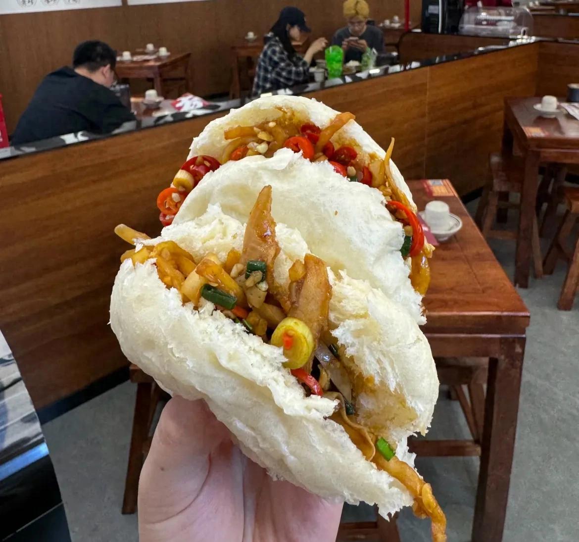 關鍵軟乎乎的大饅頭,與各種肉、菜適配度都很高,夾着不會影響原本菜的口味。