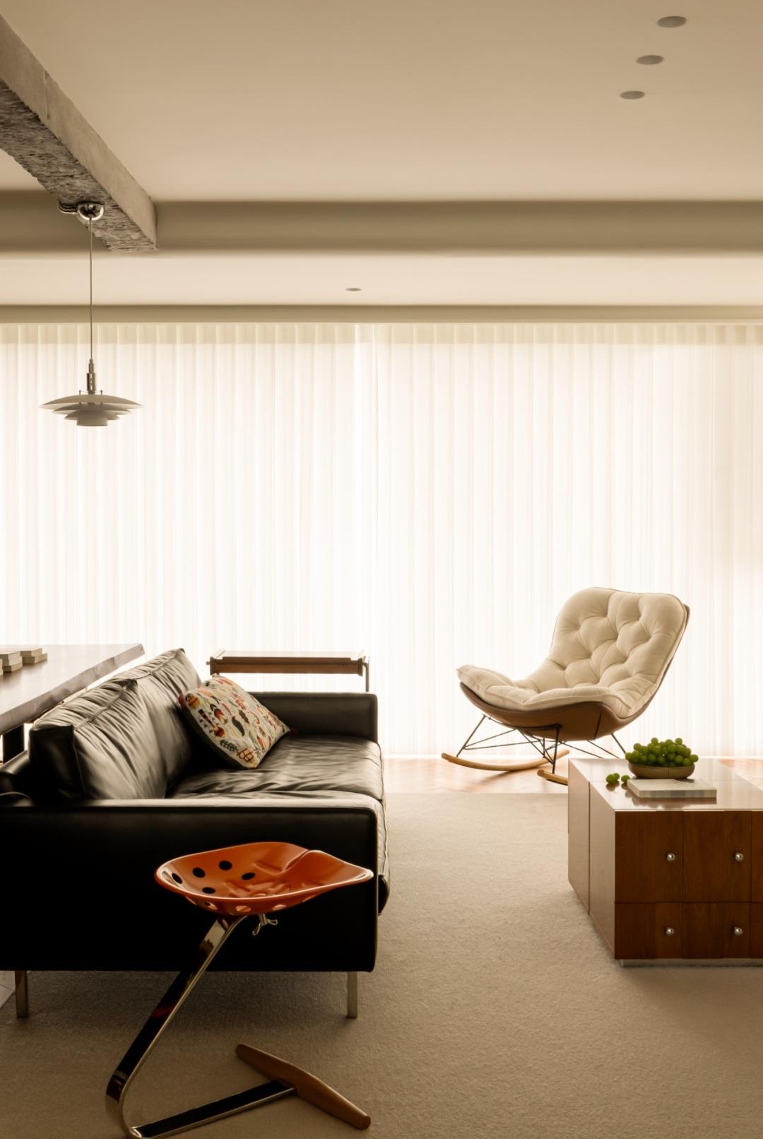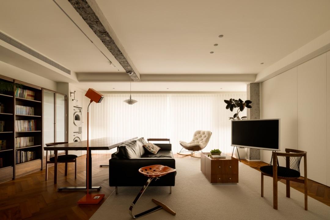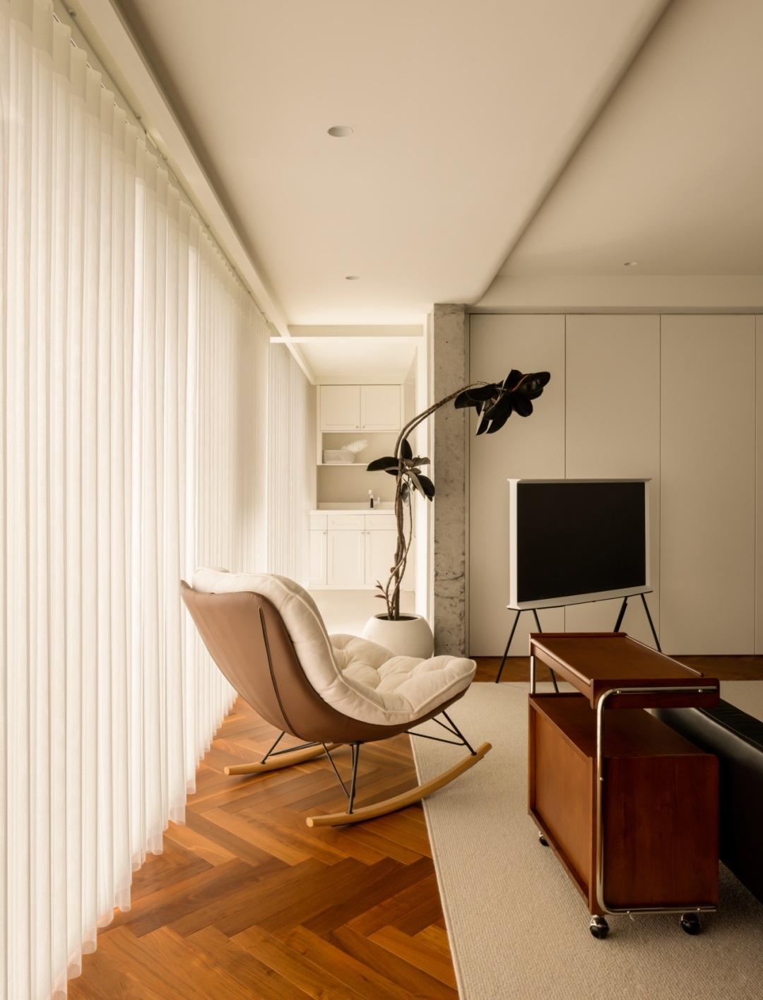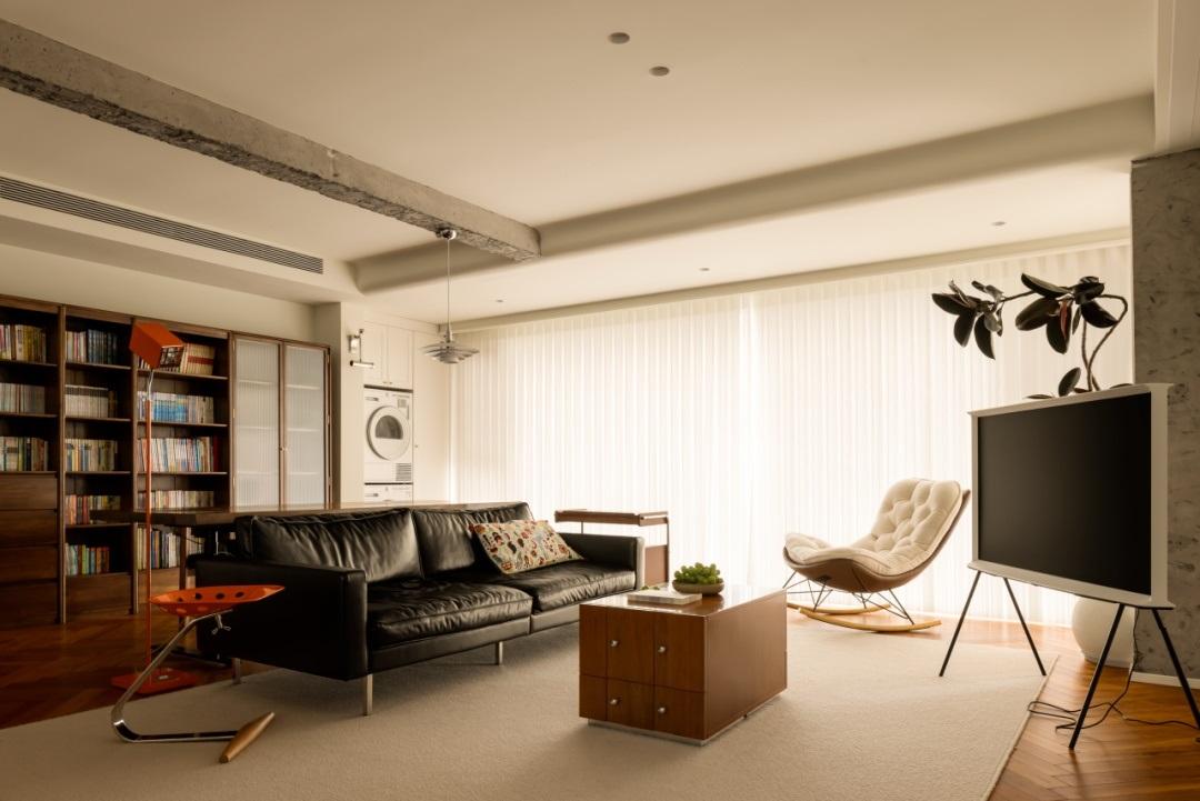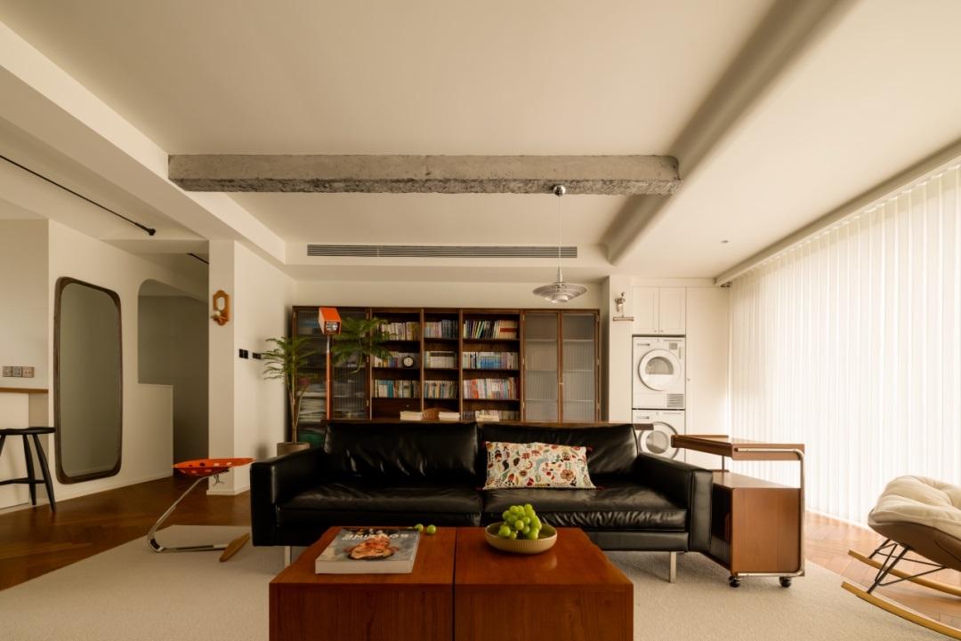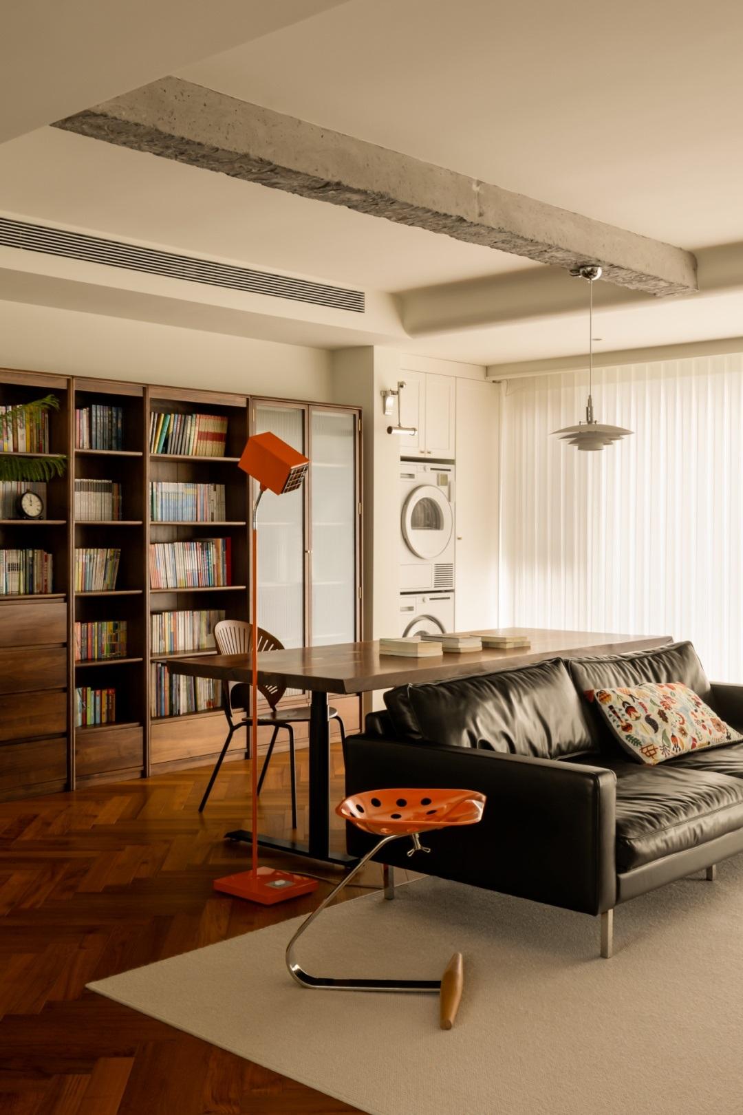 材質與設計的碰撞,訴說着一段家庭的故事。在這個戶型中,建築上方的橫樑保留着粗獷的自然質感,猶如家人之間的隱形邊界。它將客廳與書房分隔開來,彷彿在告訴我們,家是一個共享的地方,我願與你共同分享我們所擁有的一切。