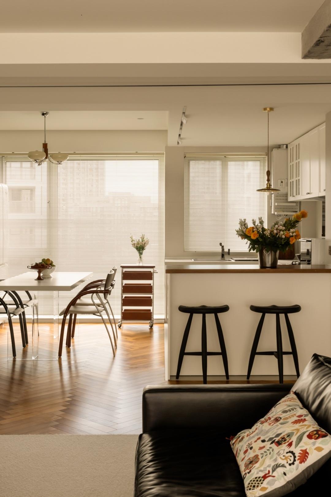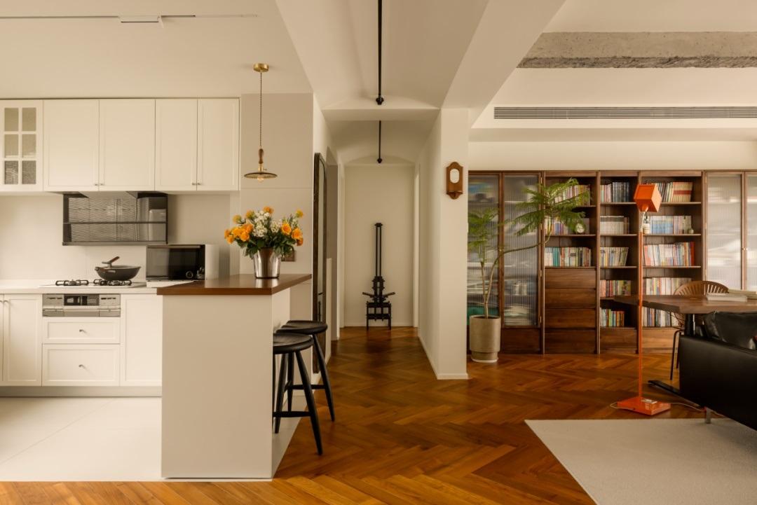開放式廚房採用奶白色的地磚。與客餐廳形成鮮明的對比。