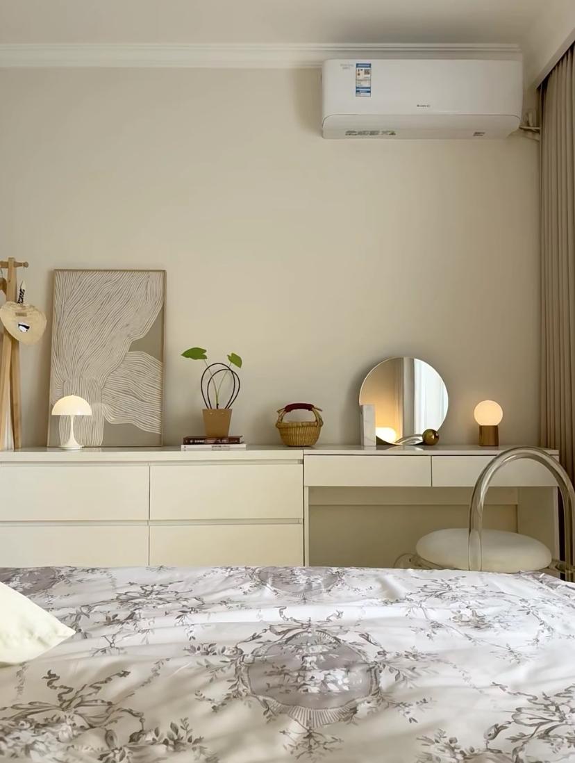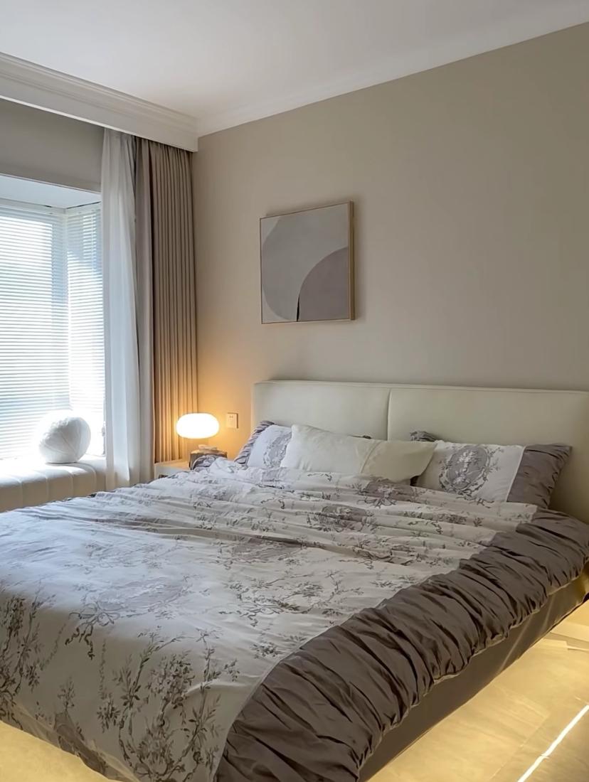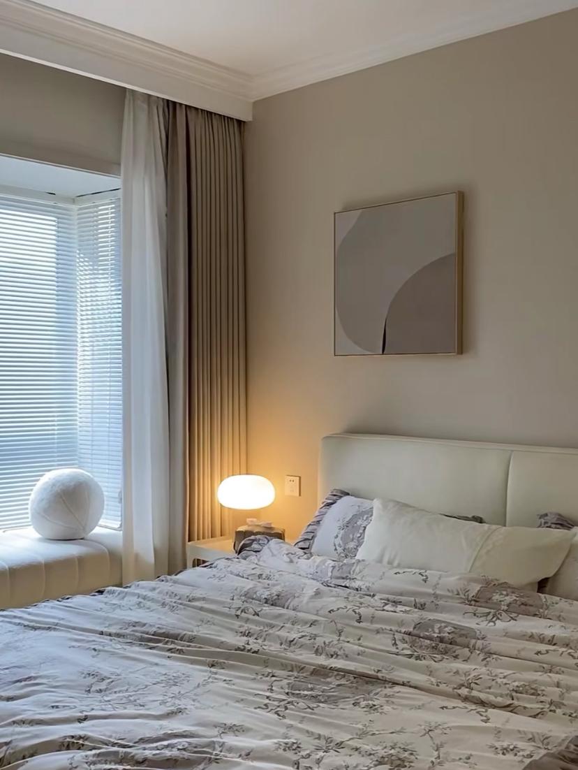 主臥想要更溫馨一些,所以乳膠漆選擇了奶茶色,可以讓牆面多一些的暖色調,搭配上牀頭和牀下的燈光氛圍,是一進門就能感受到的溫暖。