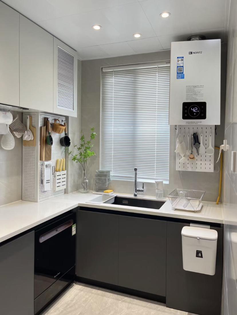 洞洞板真的是個好東西,在廚房裏尤其實用,只要有需要遮醜的地方都用上,就能給你一個美美噠的廚房,熱水器下面的水閥等也都遮起來,洞洞板上還能掛許多的勺子。