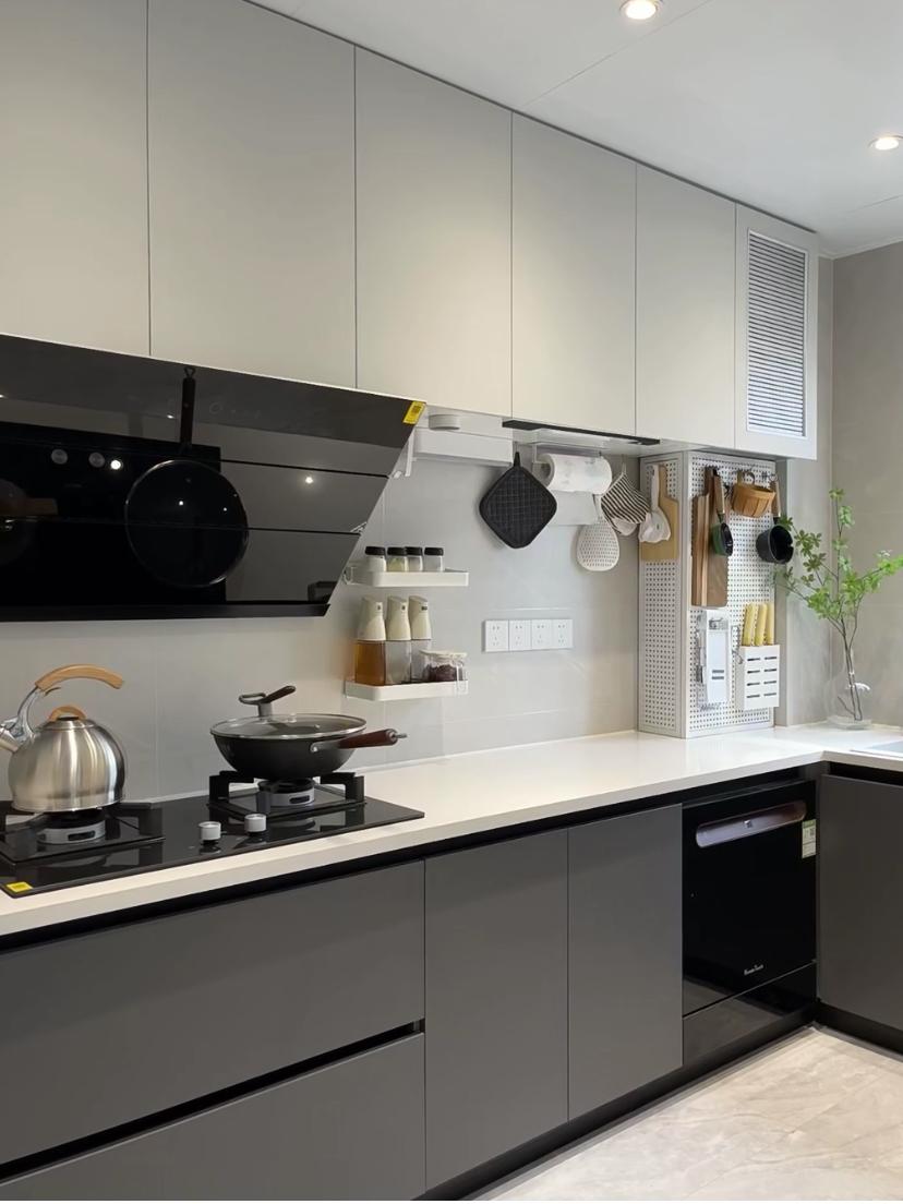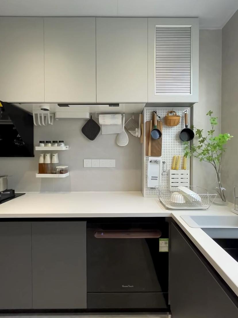 廚房的燃氣管道一般都是要讓留在外面的,但留在外面非常的難看,這裏加了洞洞板來進行遮擋,美觀了許多,洞洞板上還可以收納許多的廚房小物件,讓廚房的檯面可以儘量不擺放物件,不顯亂。
