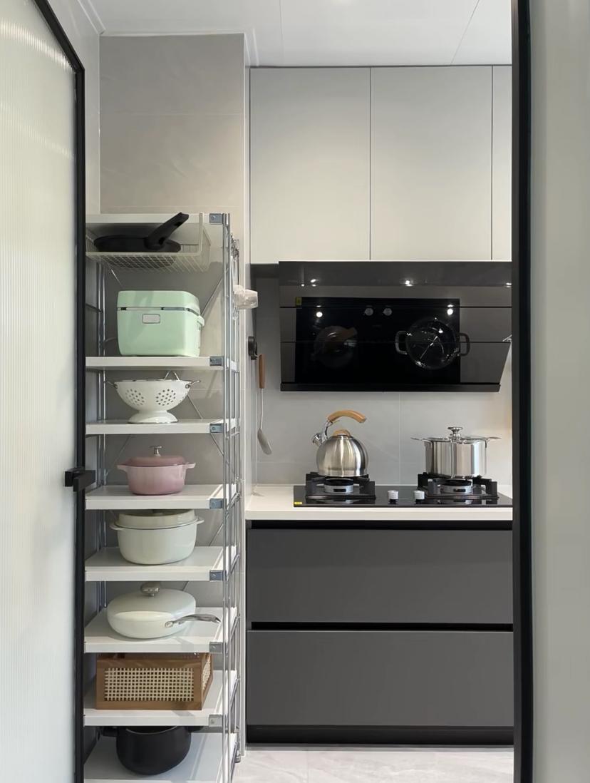 當初裝修廚房的時候,因爲擔心門扇不好打開,就在門口的位置留出足夠多的空間,後面入住後發現空間留得有些多,就在門口的位置增加了一組廚房收納架,可以擺放許多的廚房小家電,門後的小空間也不能浪費掉一絲一毫。