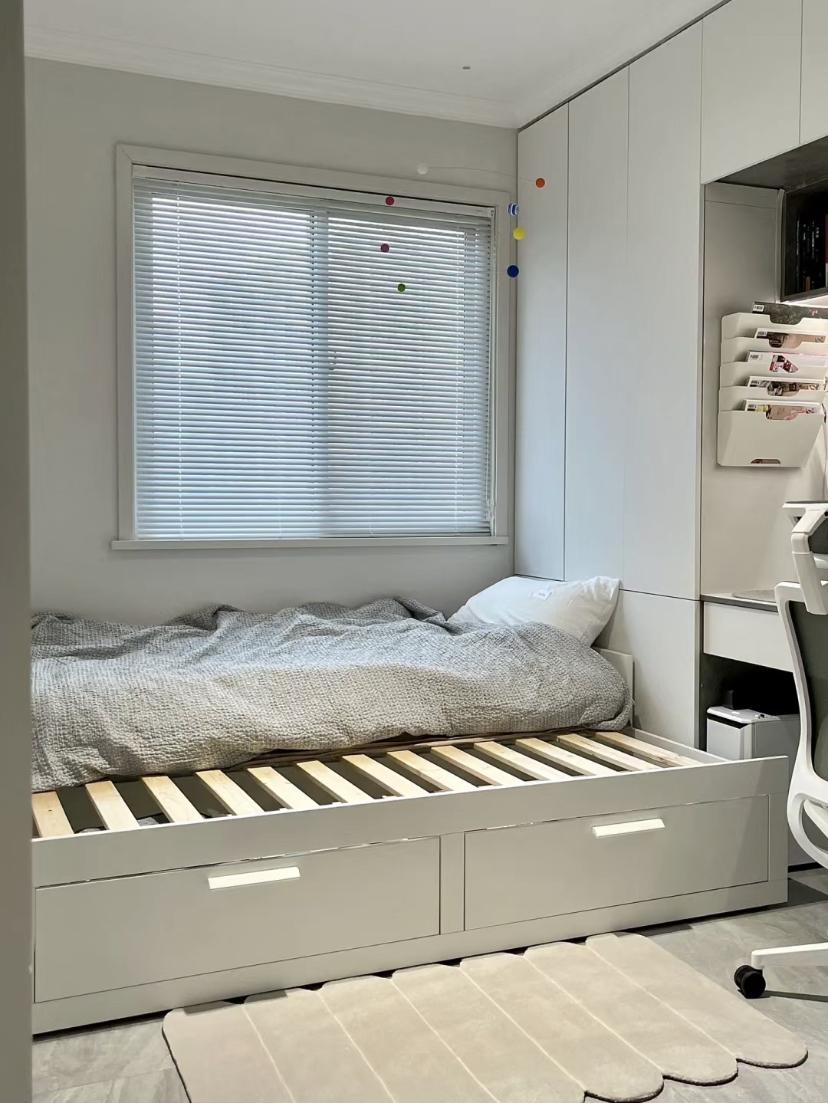 榻榻米做到是可抽拉的收納櫃,搭配的是鏤空的排骨架,讓榻榻米既帶有收納功能,又能透氣舒適,比成品牀都好用。