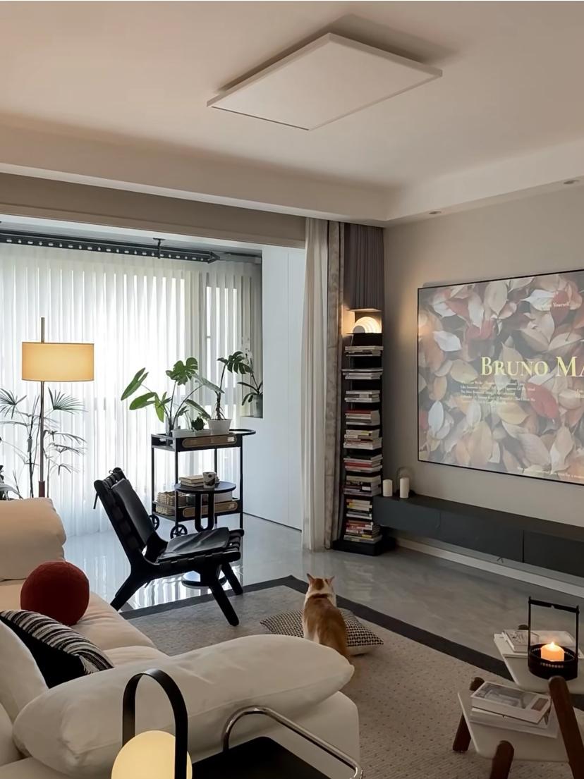 將電視機捨棄掉,換成大尺寸的投影幕布,追劇更爽一些。在電視牆的左側角落裏,還擺放了一個開放式的小書架,書架頂部還有一盞小小的燈,小小的一個裝飾物,把電視牆裝扮得很有氛圍感。