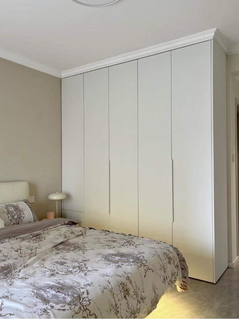 一門到頂的衣櫃,不做任何的分隔,讓櫃子的存在感可以低一些,櫃門的裝飾性更高一些,同色系的把手也能很好的融入櫃子的整體中,讓櫃子可以更統一。