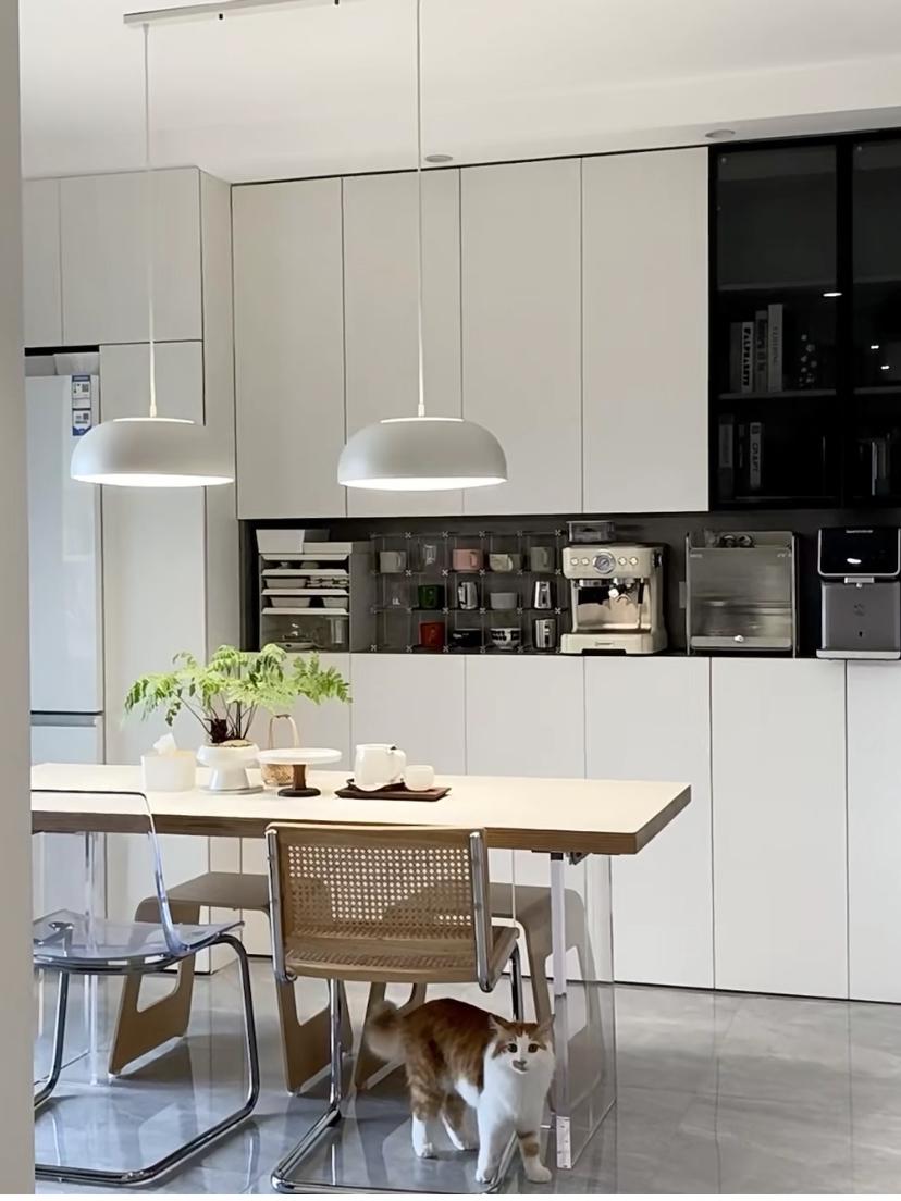 將多多做櫃子這件事貫徹到底,餐廳的側牆面安排上一整排的櫃子,並將冰箱也收納到這個櫃子,讓每個空間都規規整整。白色的櫃門上還搭配了灰色的玻璃酒櫃,讓淺色系的櫃子能更有顏色的層次感。