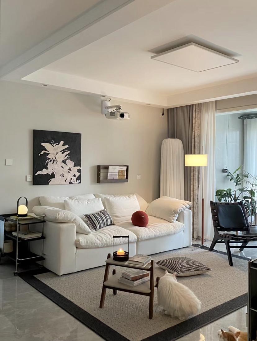 白色乳膠漆的牆面加一點裝飾物件就可以是一個還不錯的沙發背景牆,帶花朵的裝飾畫,還可以增加牆面的靈動感,旁邊還有一個帶有收納功能的小收納架,隨手放上幾本雜誌,拍照超出片。