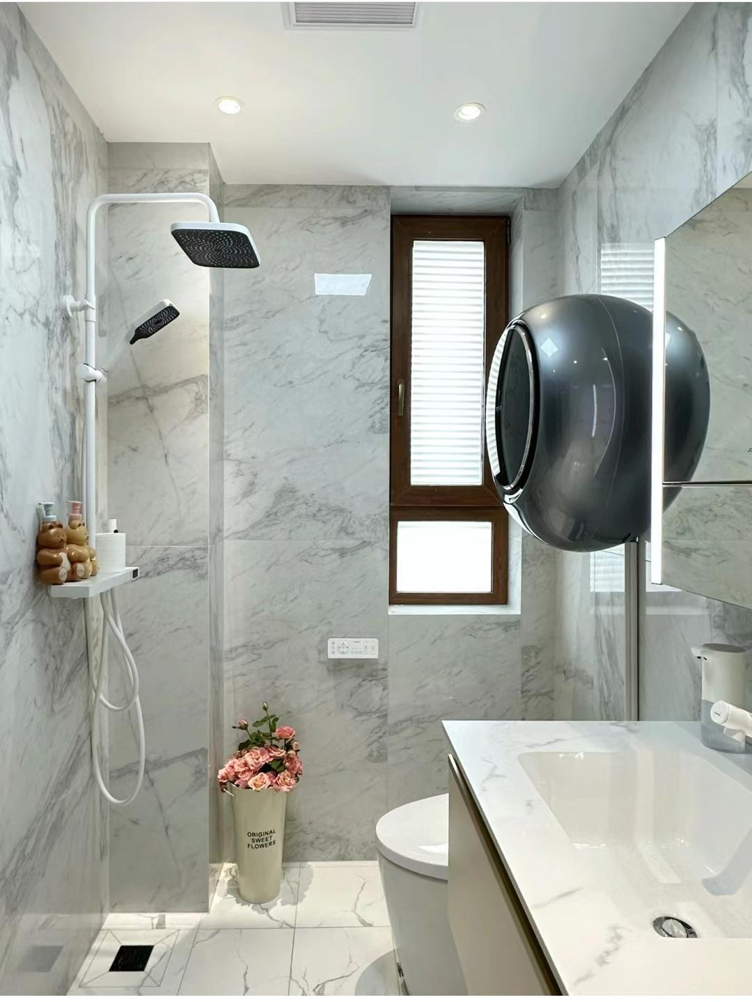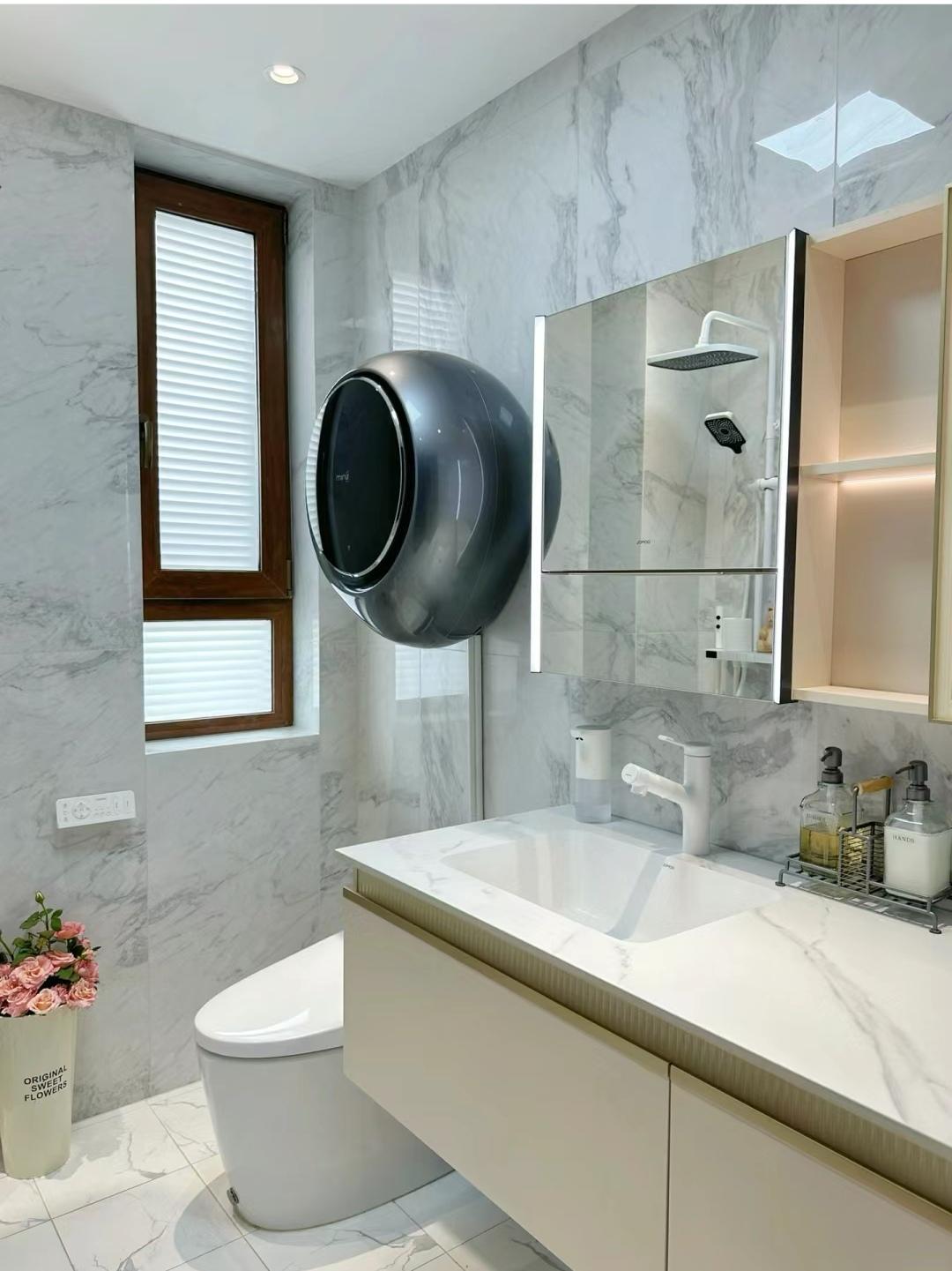 這個衛生間被定義爲功能性衛生間,基本不會用這個衛生間洗澡,安裝了一個壁掛洗衣機,懶得手洗的小內內全放進去洗了。