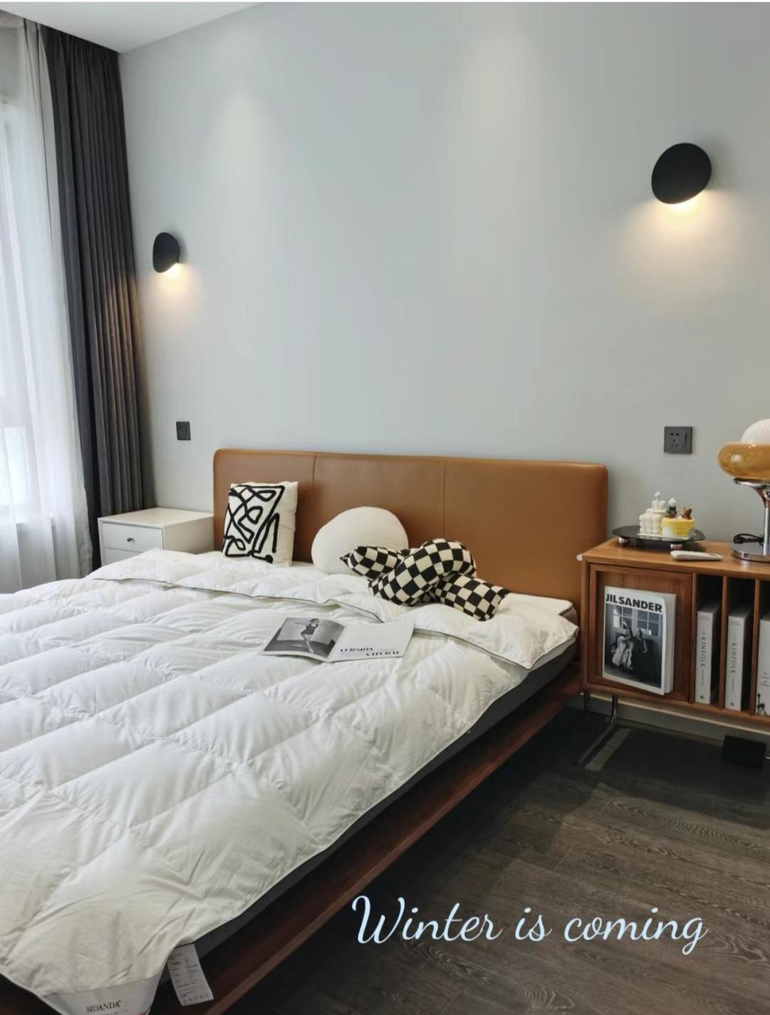 房間14平,長4.67m*寬3m,牀選了1.8m的雙人牀,所有臥室的牆面都是用的乳膠漆,顏色是裝修公司現場調的,白色乳膠漆加黑色顏料,一點點加,顏色滿意爲止。