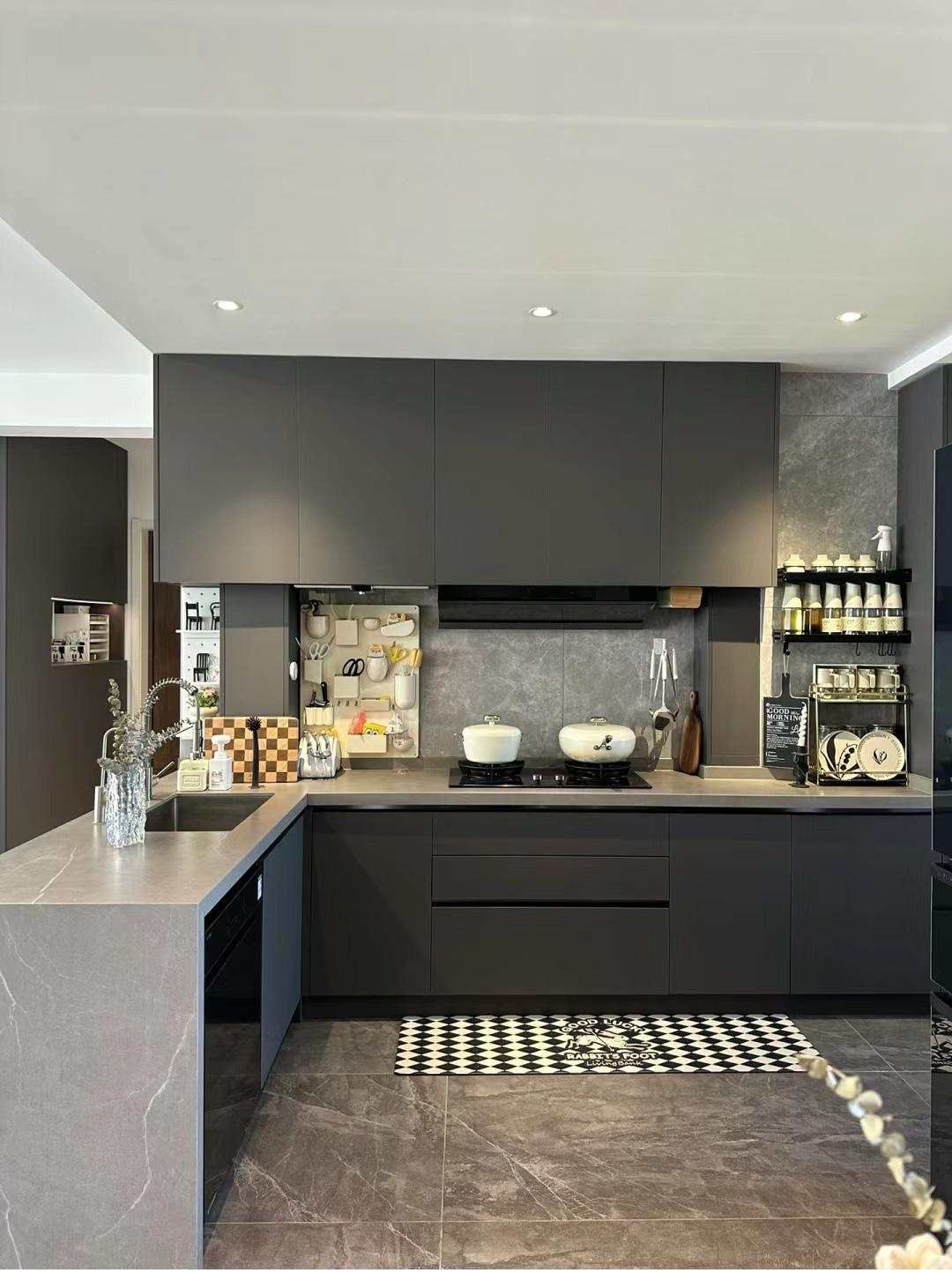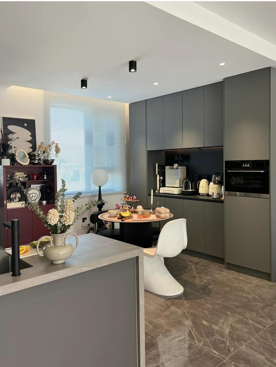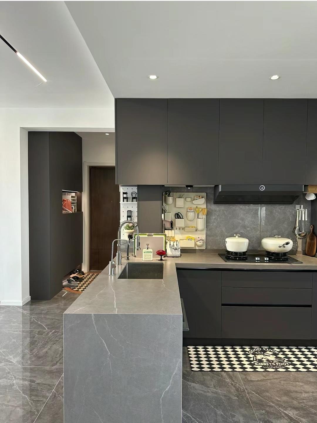 整體色調以灰色系爲主,櫃子都用了深灰色啞光質地的櫃門板,檯面採用的是巖板。