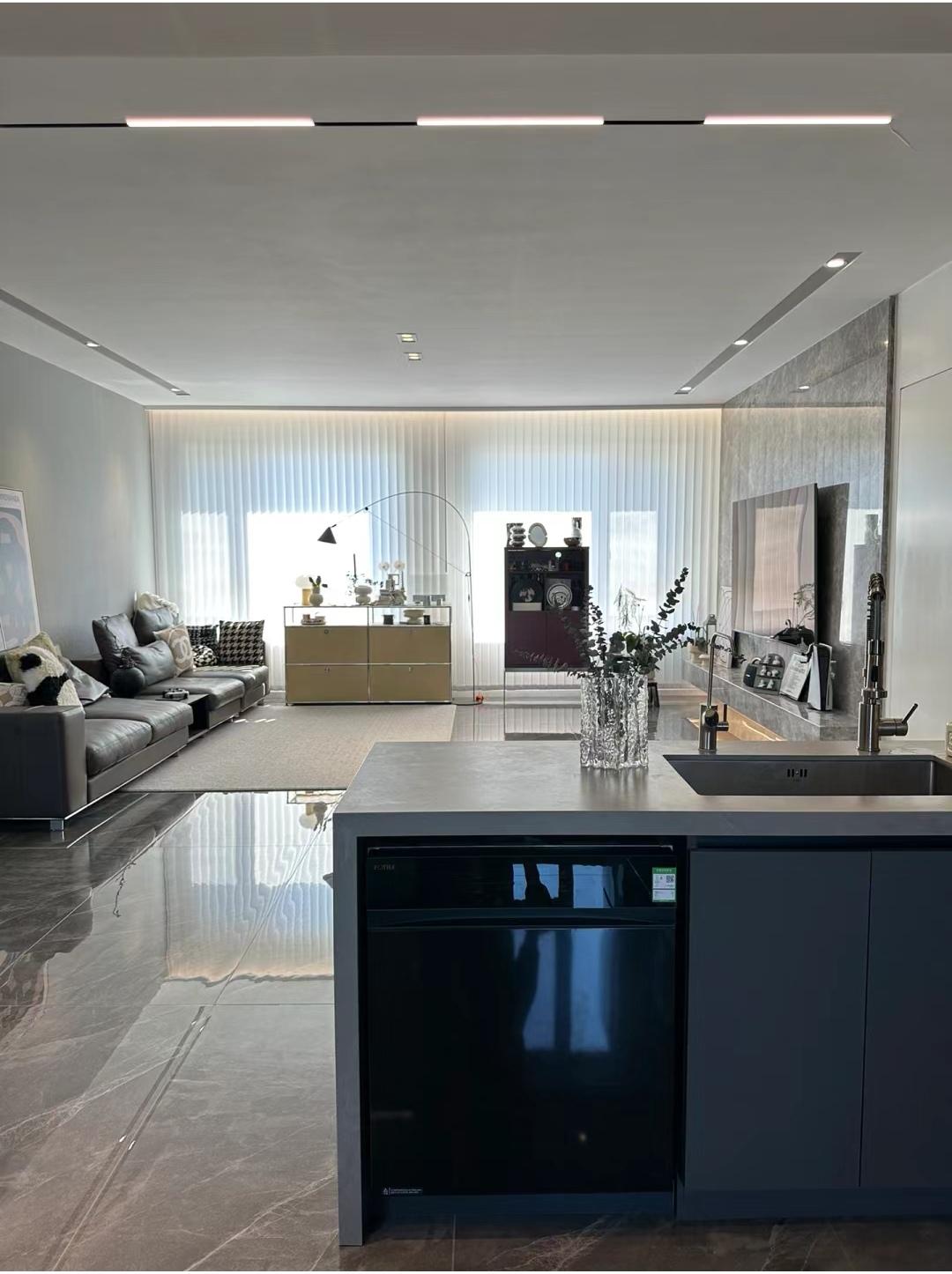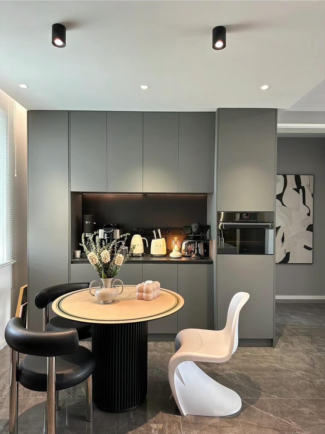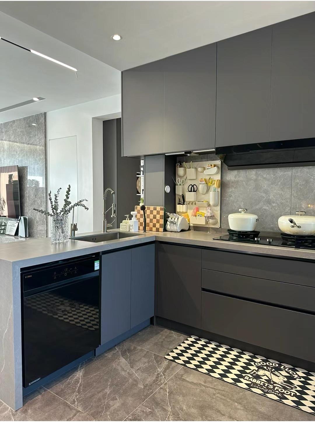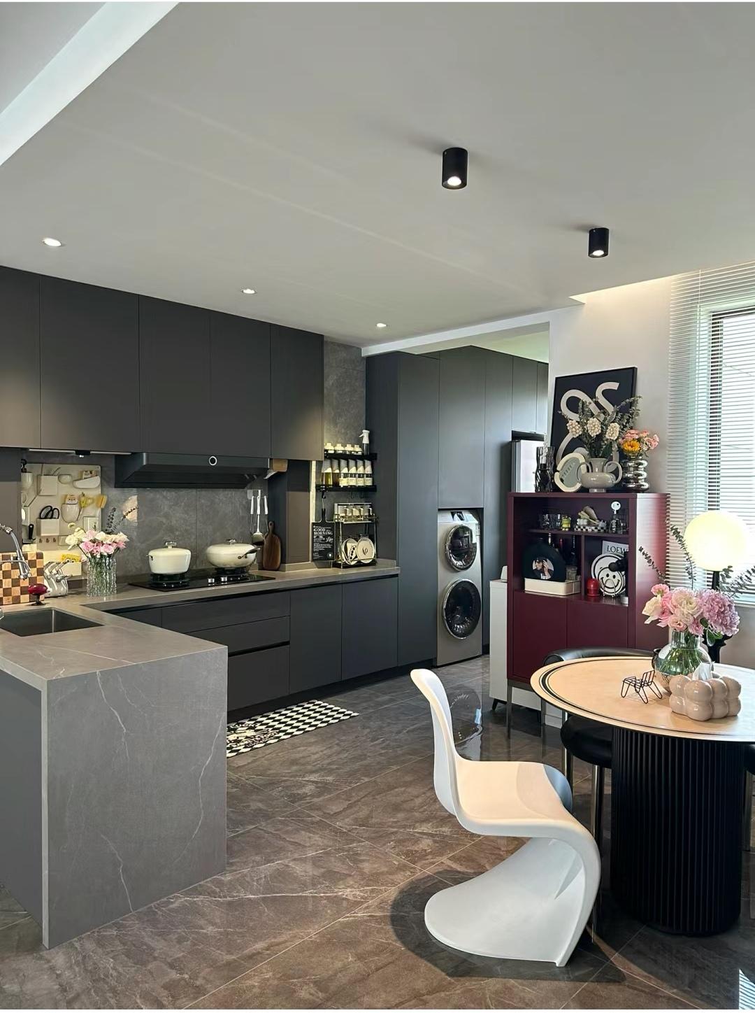 整體色調以灰色系爲主,櫃子都用了深灰色啞光質地的櫃門板,檯面採用的是巖板。