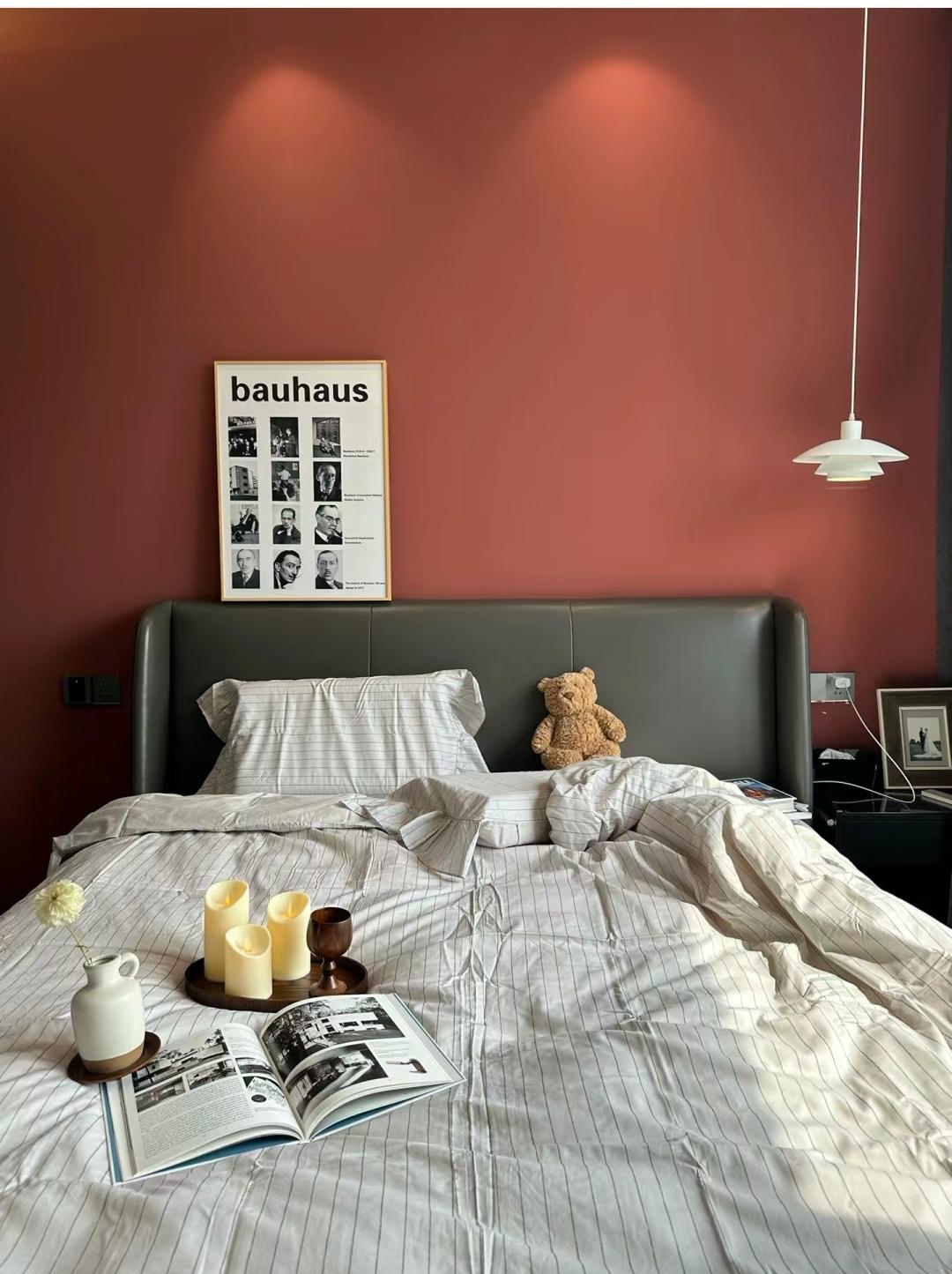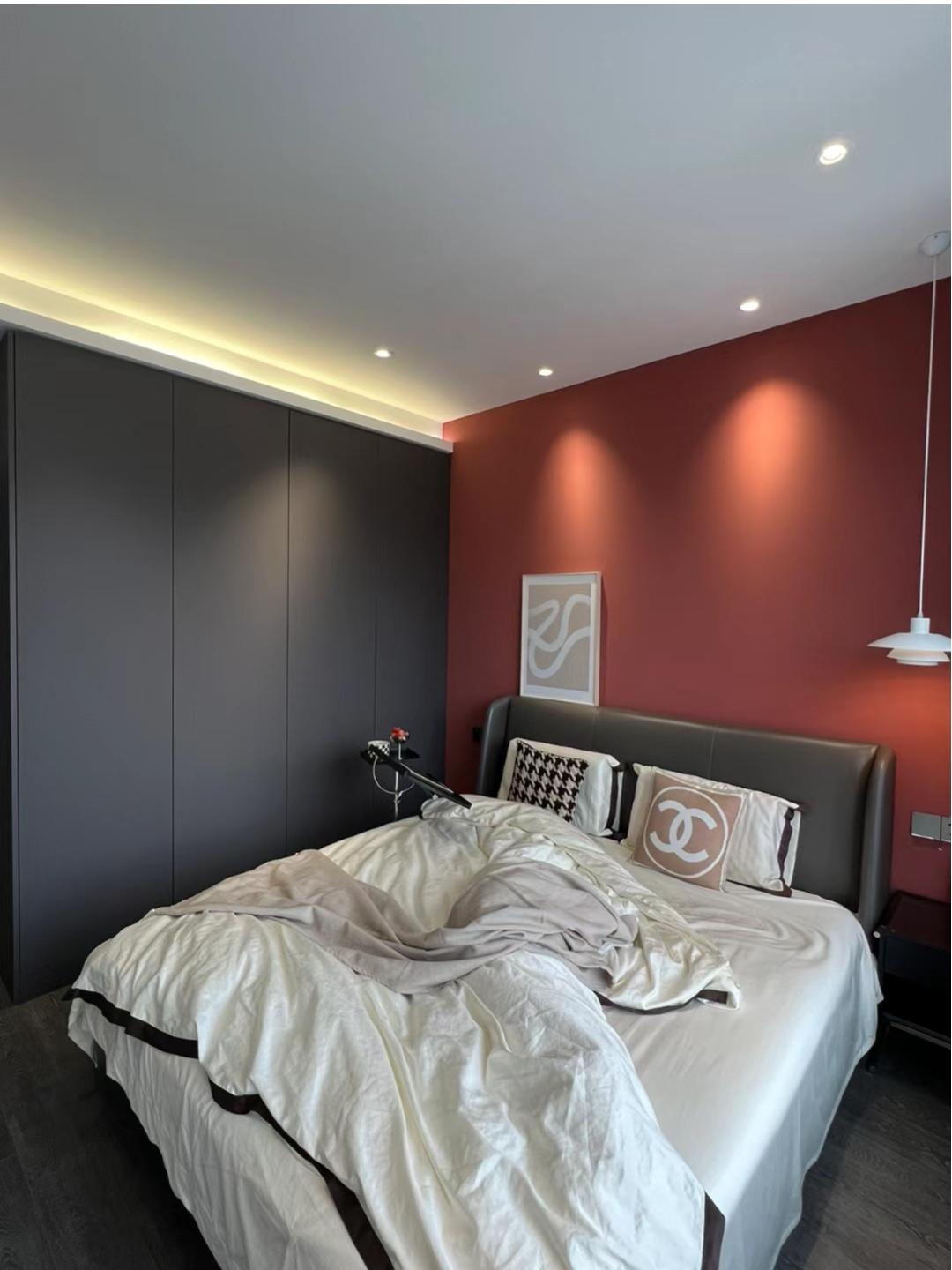 臥室13㎡,發了1.8m的牀,2m的衣櫃,牀頭櫃和五斗櫥,麻雀雖小五臟俱全。除了牀頭背景牆是故宮紅,其餘都是淺灰色,嘉寶莉的易呼吸系列,碧落,色號:PB 38 73 01-P。