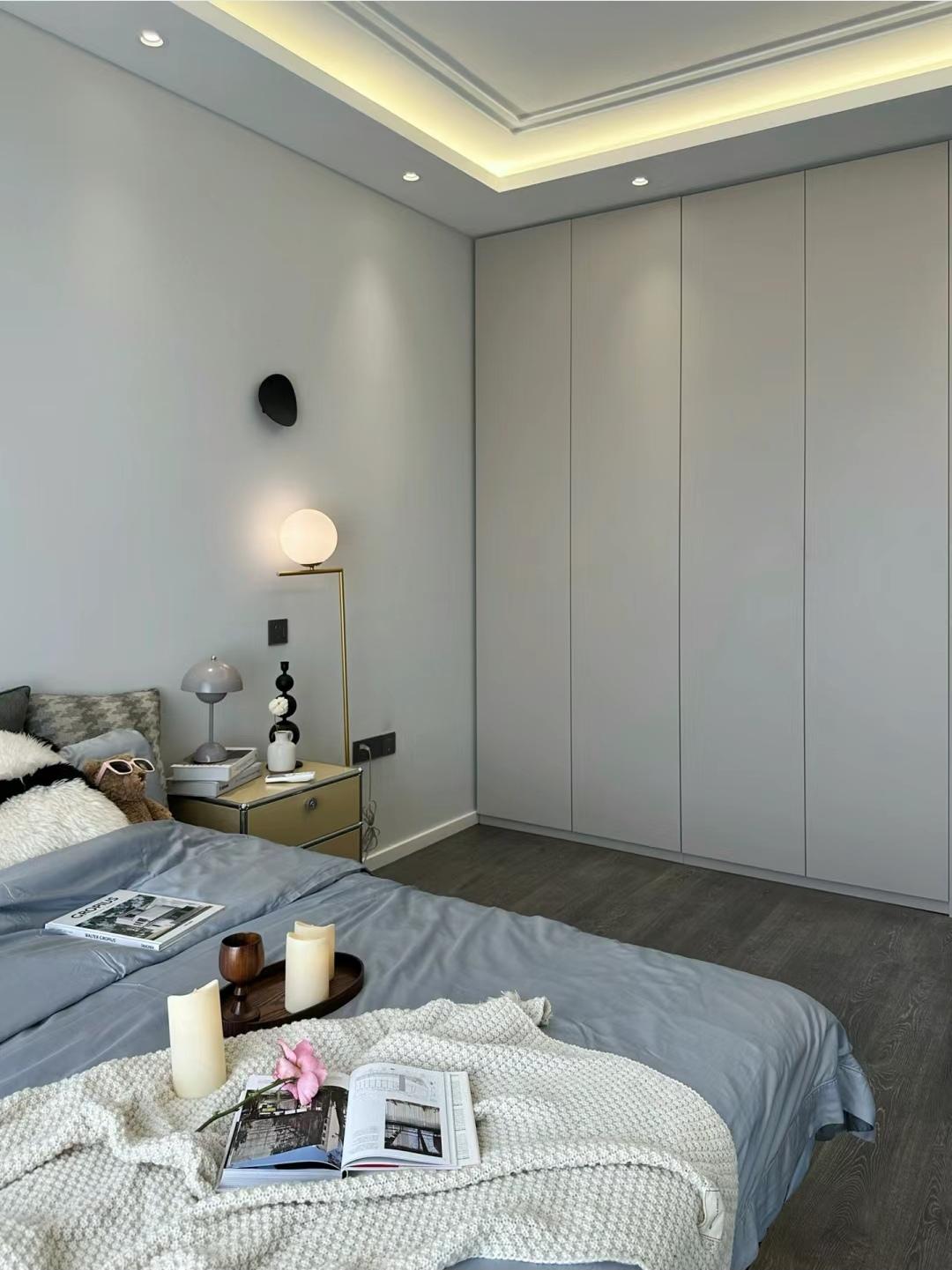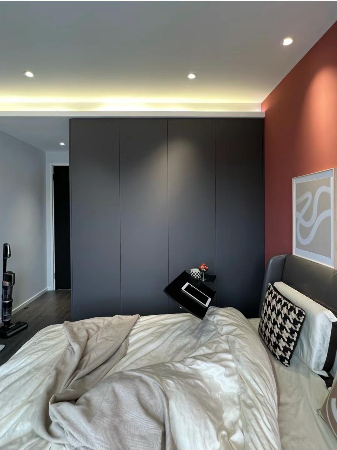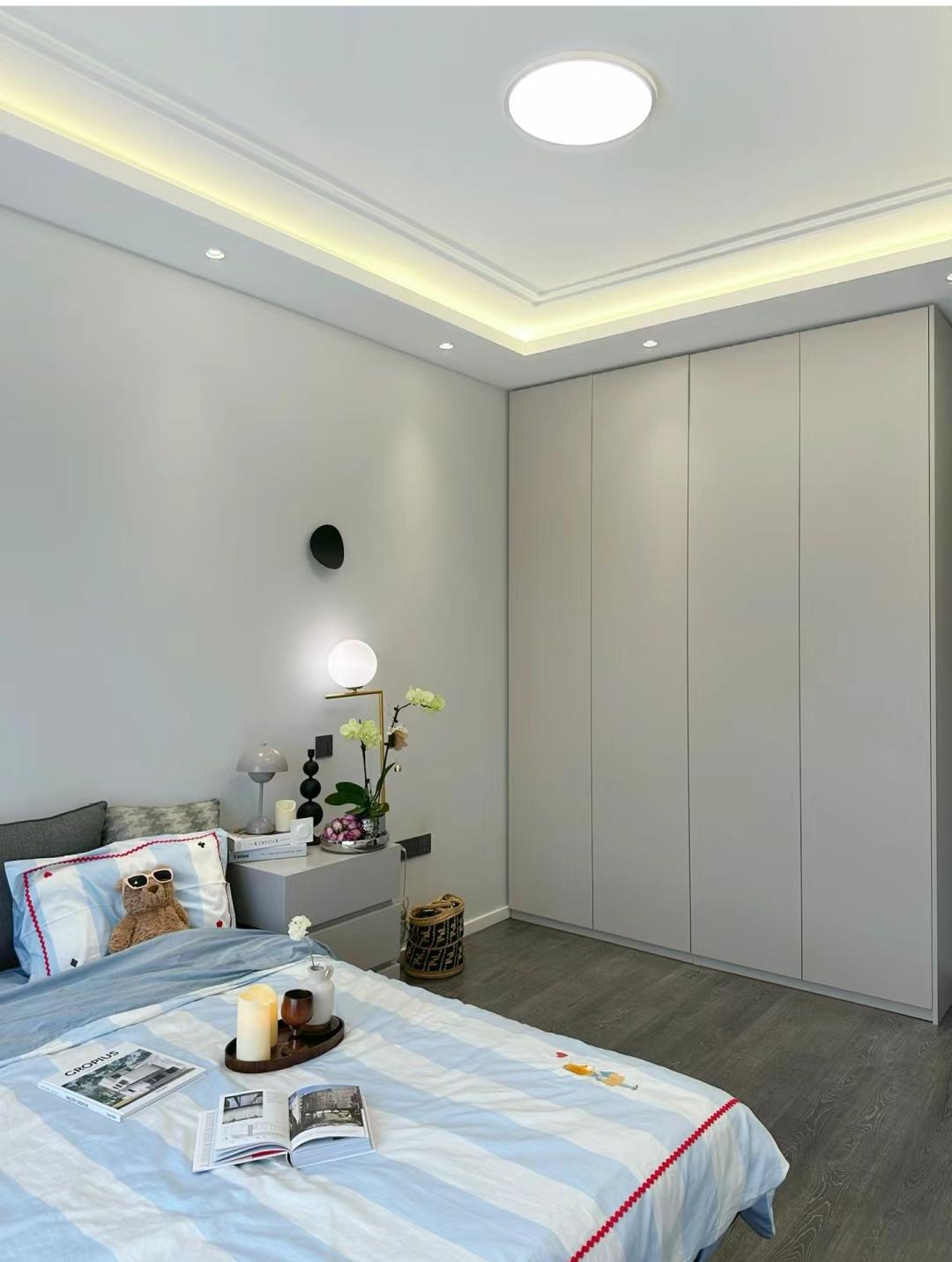 臥室做的也是無主燈的設計,在頂面用石膏板做了一個平頂,在衣櫃的頂面加了線性燈帶,讓衣櫃頂面的空間多一些的通透感。