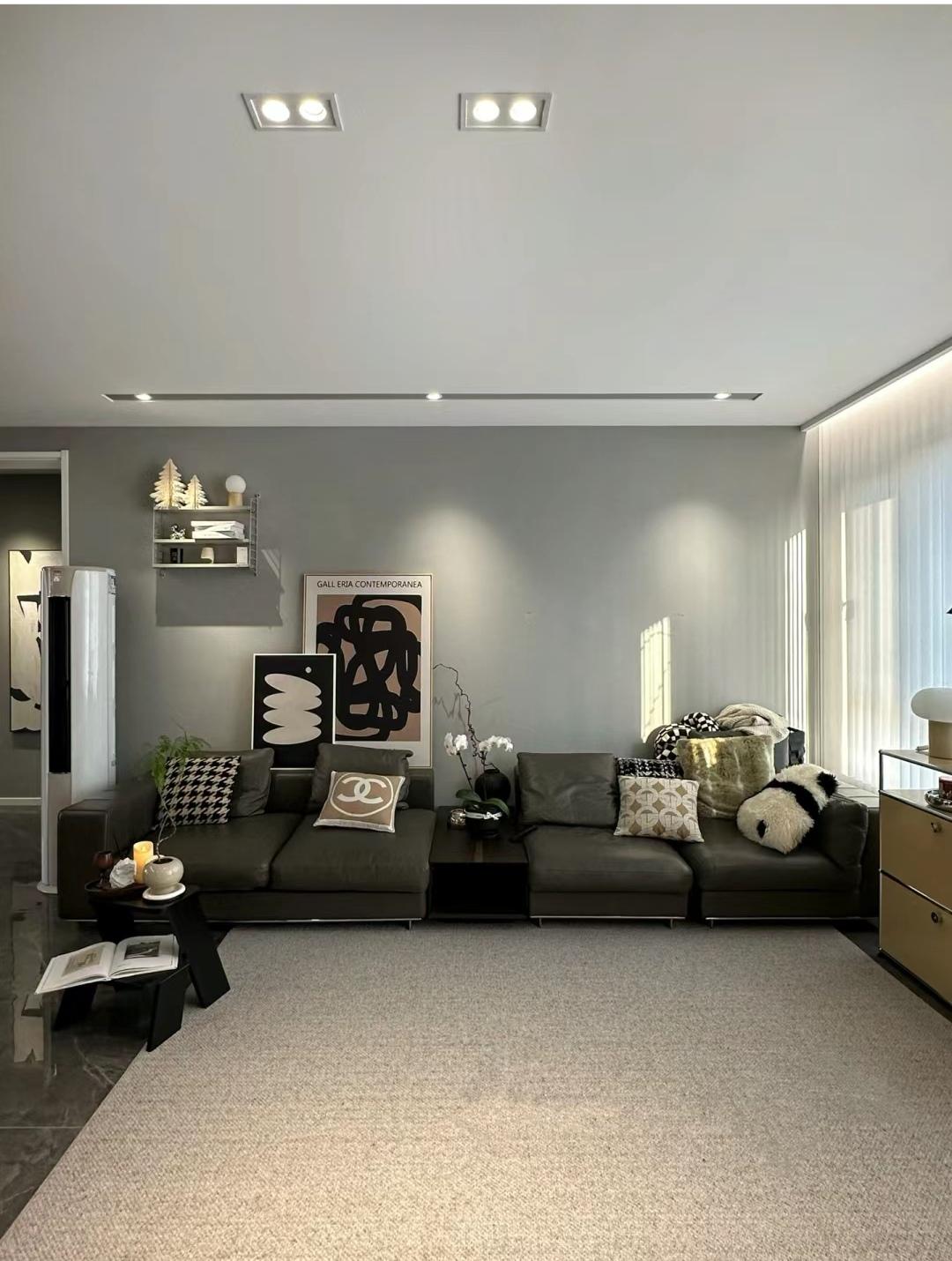 沙發背景牆寬4.835m,高2.8m,沙發長3.75m 。乳膠漆選的是嘉寶莉的易呼吸系列,客廳色號是雕刻灰(中灰),整面牆的刷,很高級。