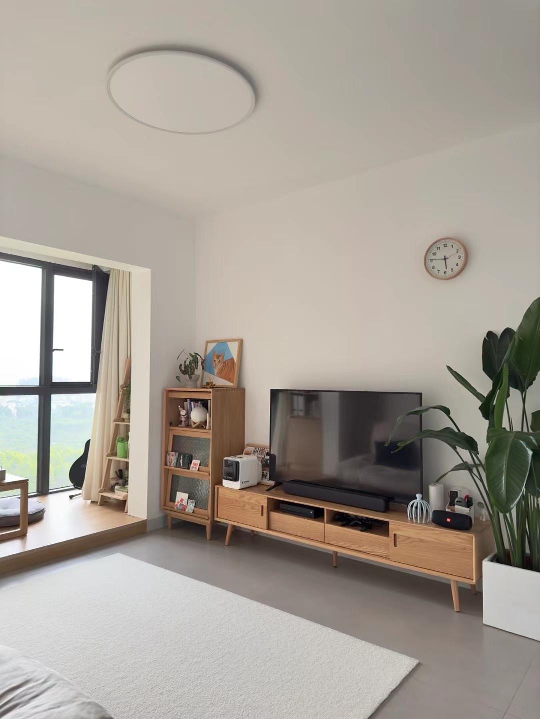 客廳這邊頂面的吸頂燈選的是圓形的,和電視牆上佈置的小掛鐘一樣,都是圓圓的,大圓加小圓的佈置,簡單又協調,讓小掛鐘也能很有裝飾性。