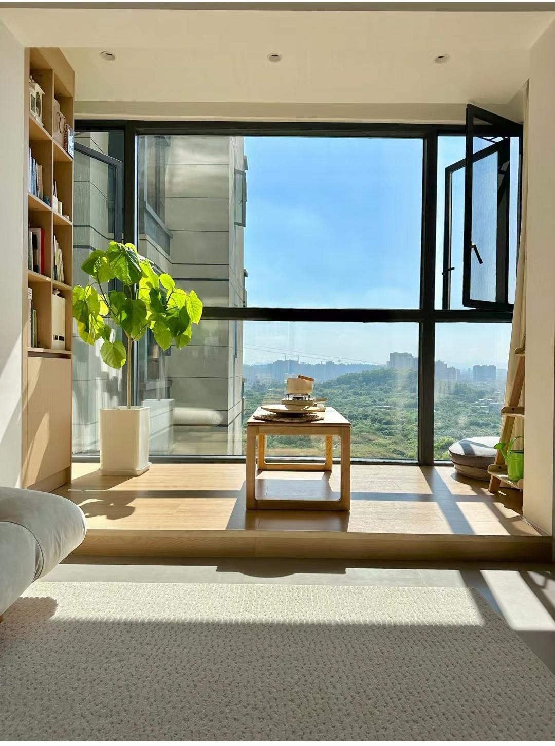 陽臺封窗和客廳連接在一起,視覺上看着更有延伸性,將陽臺地面抬高8公分,又能將陽臺的區域分離出去,讓陽臺形成一個獨立的休閒空間。
