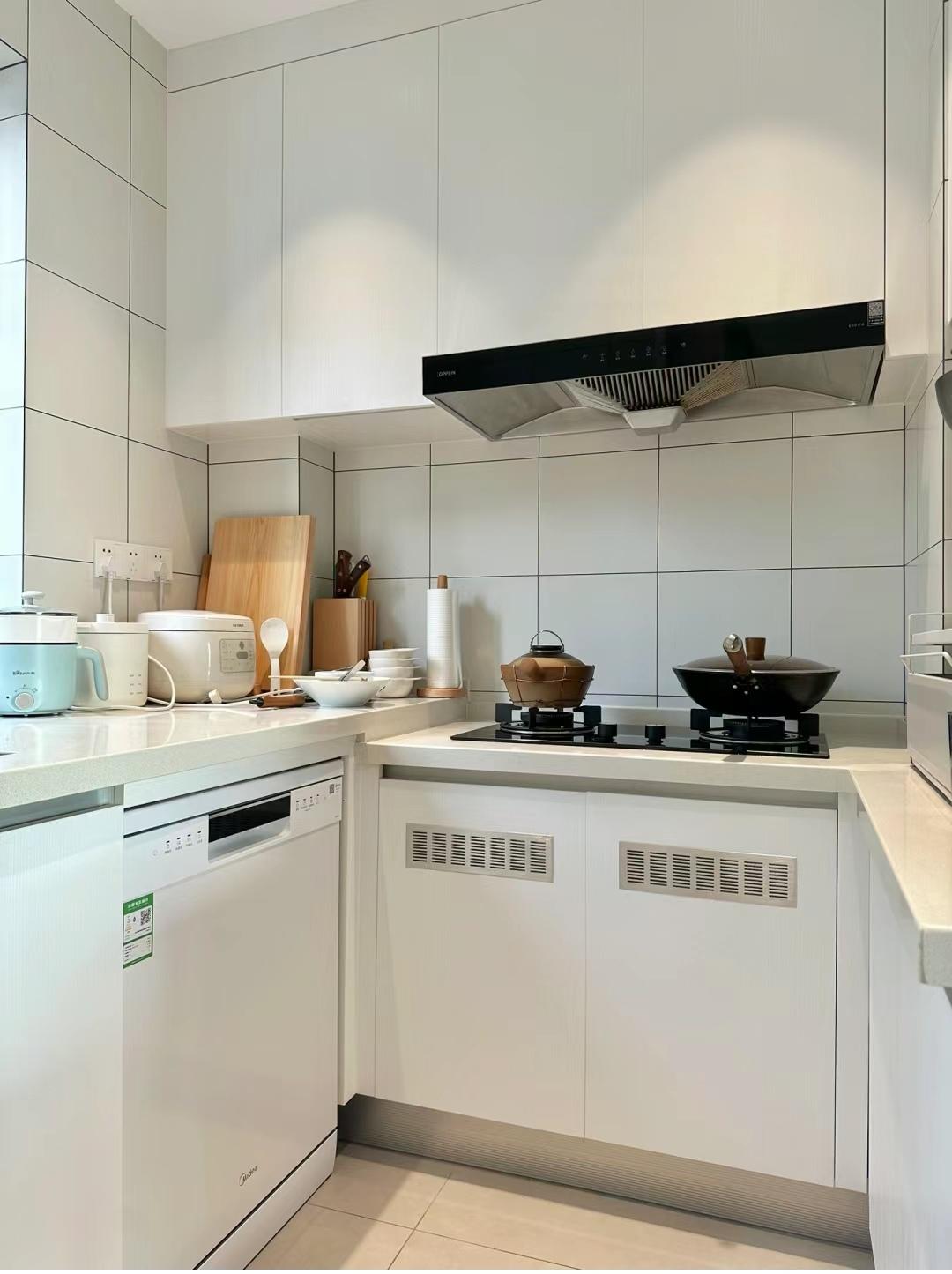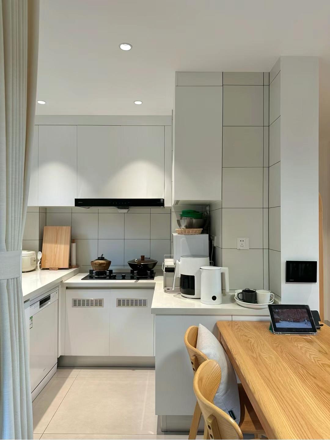 白色的廚房,是由牆面白色的牆磚和白色的櫥櫃組成,甚至還有白色的檯面,檯面做了高低臺的設計。讓這個小廚房不僅是有顏值,更是有更好的實用性。