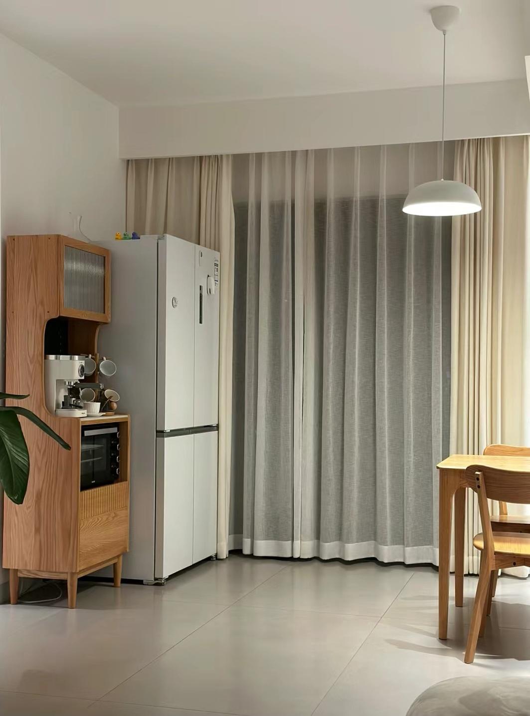 要留出冰箱的收納空間,餐廳的側牆面就剩下的不多了,在本地的傢俱市場掏了一個小鬥櫃,擺放在冰箱的旁邊,剛好合適,還讓餐廳多了一個水吧檯。