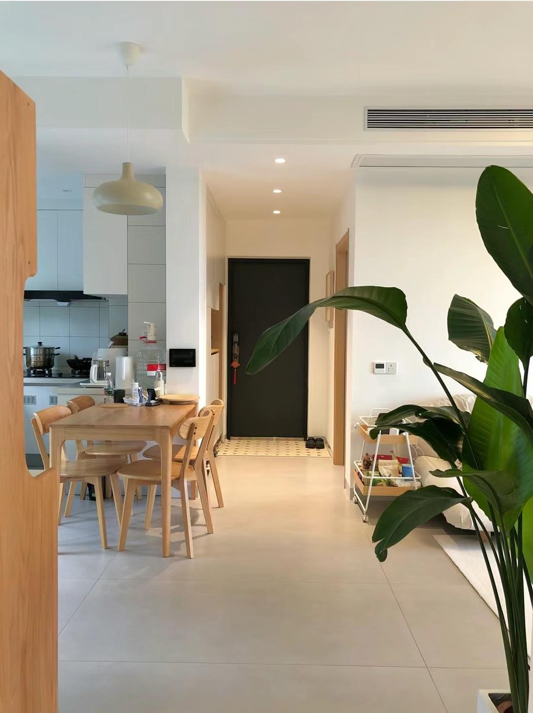 這個房子的整體面積不是特別大,拆除廚房與餐廳之間的隔牆,做了玄關、客餐廚一體式的設計。地面灰色的地磚,不僅是和原木風格很搭,還能滿足廚房的防水防污效果,地面不用做任何的分割。