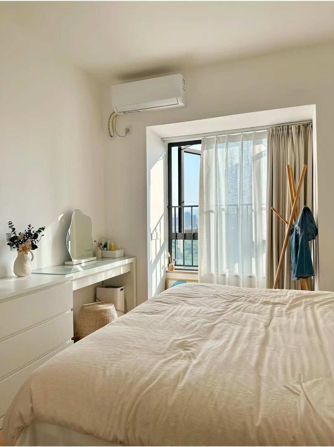 將假飄窗拆除掉,讓臥室能多出一個小陽臺,這裏擺放了一個實木的落地衣架,將要穿的衣服隨手掛起來,比一飄窗亂七八糟的衣服看着美觀太多。