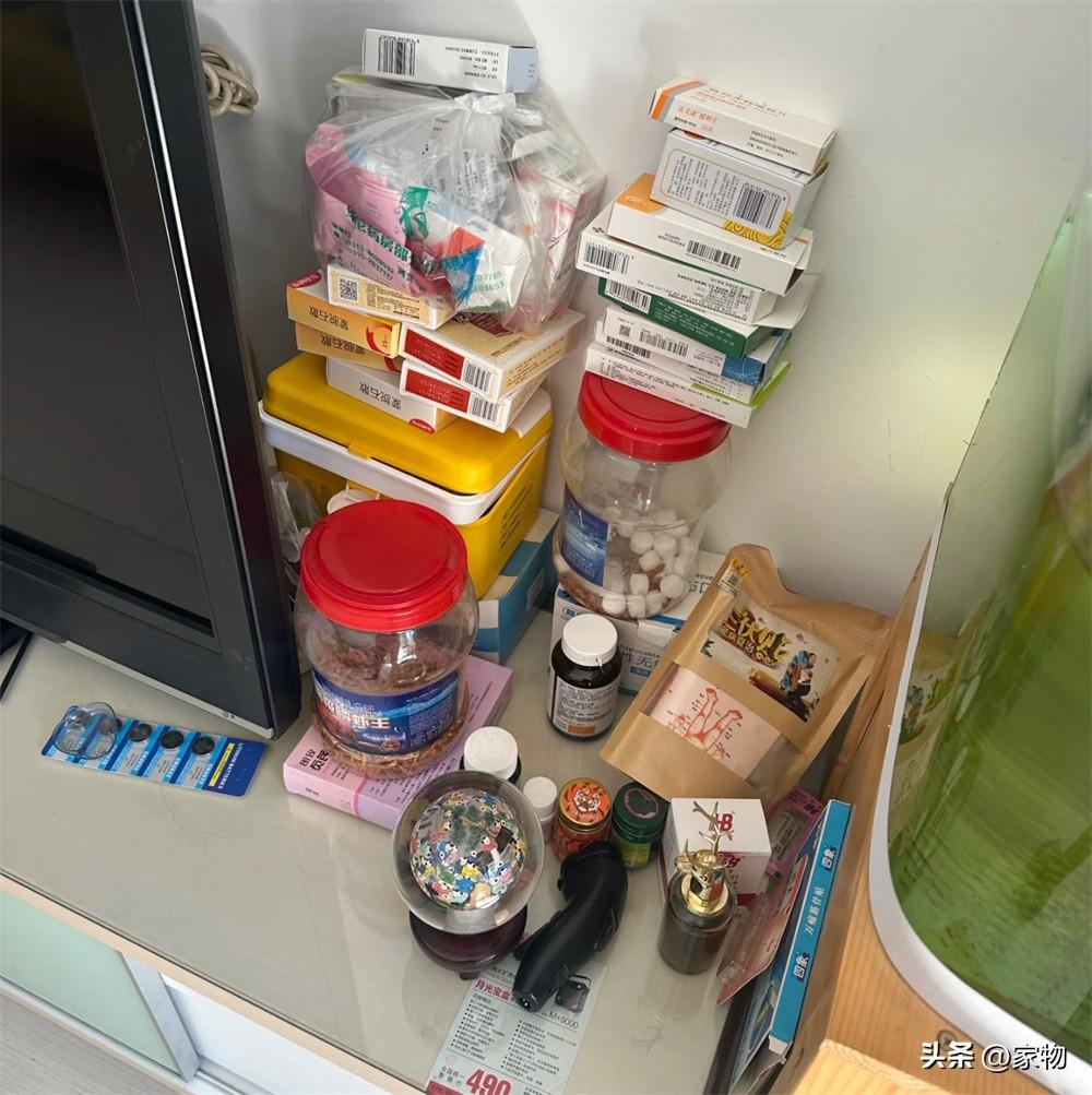 就連對面的電視櫃的邊邊角角,也堆滿了包括藥盒、電池、水晶球、零食盒在內的,各種風馬牛不相及的雜物,想做一次大掃除,這最初的分類收納就要花大量的時間,可見其日常生活有多潦草。