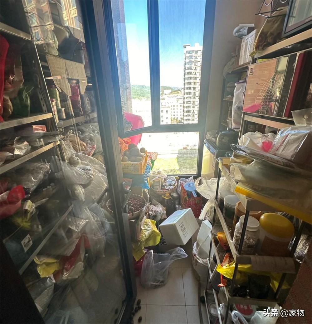 廚房還有個後陽臺,本來還做了架子,但現在架子上受案的物品層層相疊,早已過期,而新的物品又源源不斷堆到屋內,持續侵佔着地面空間,現在就連陽臺門都被堵住,不能再正常開關了,實在可怕。