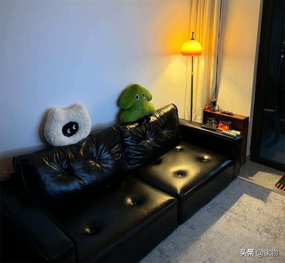 這張長沙發很有意思,黑色沙發、灰色地毯與原本的地磚和牆面就很搭不說,關鍵它還很舒服,單是沙發的坐深,就佔據了80公分,將近開間的一半,躺上去不會讓腿半懸空。