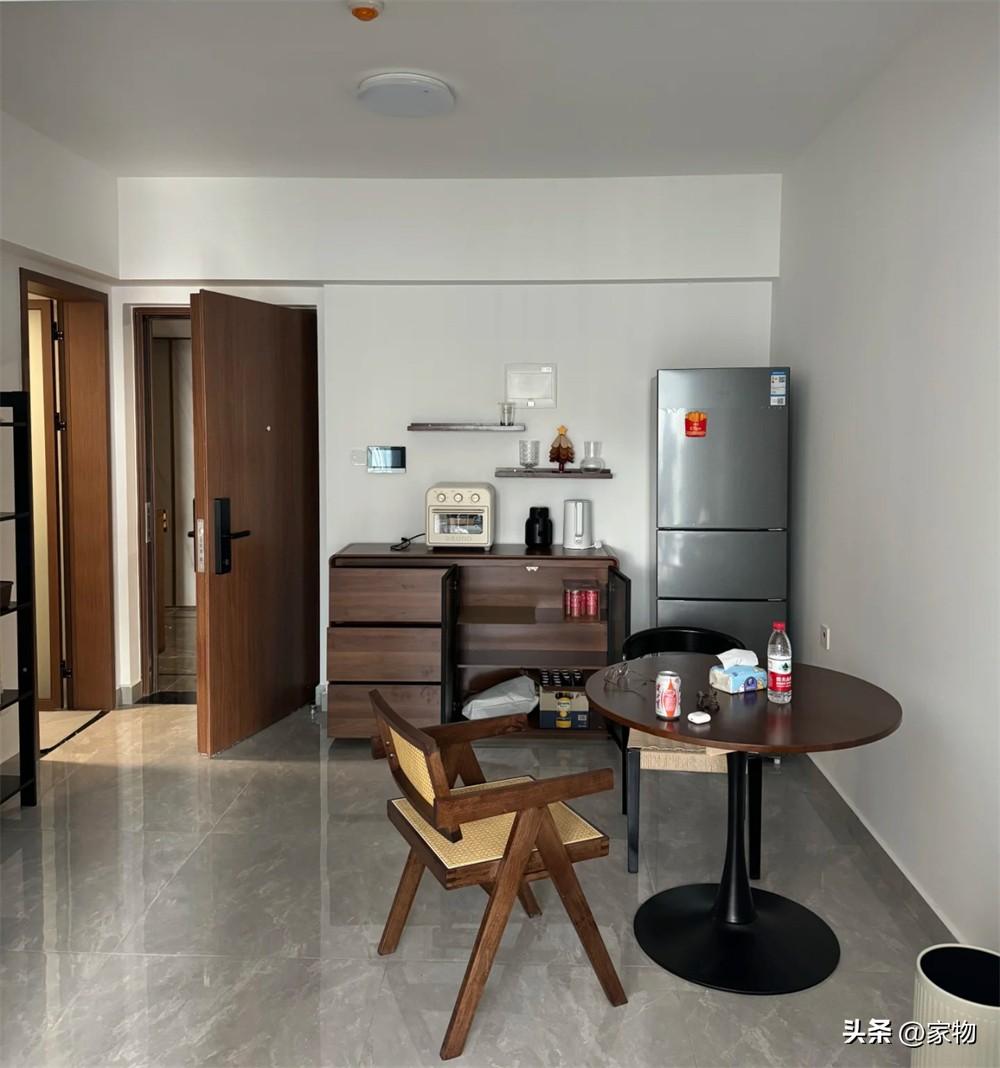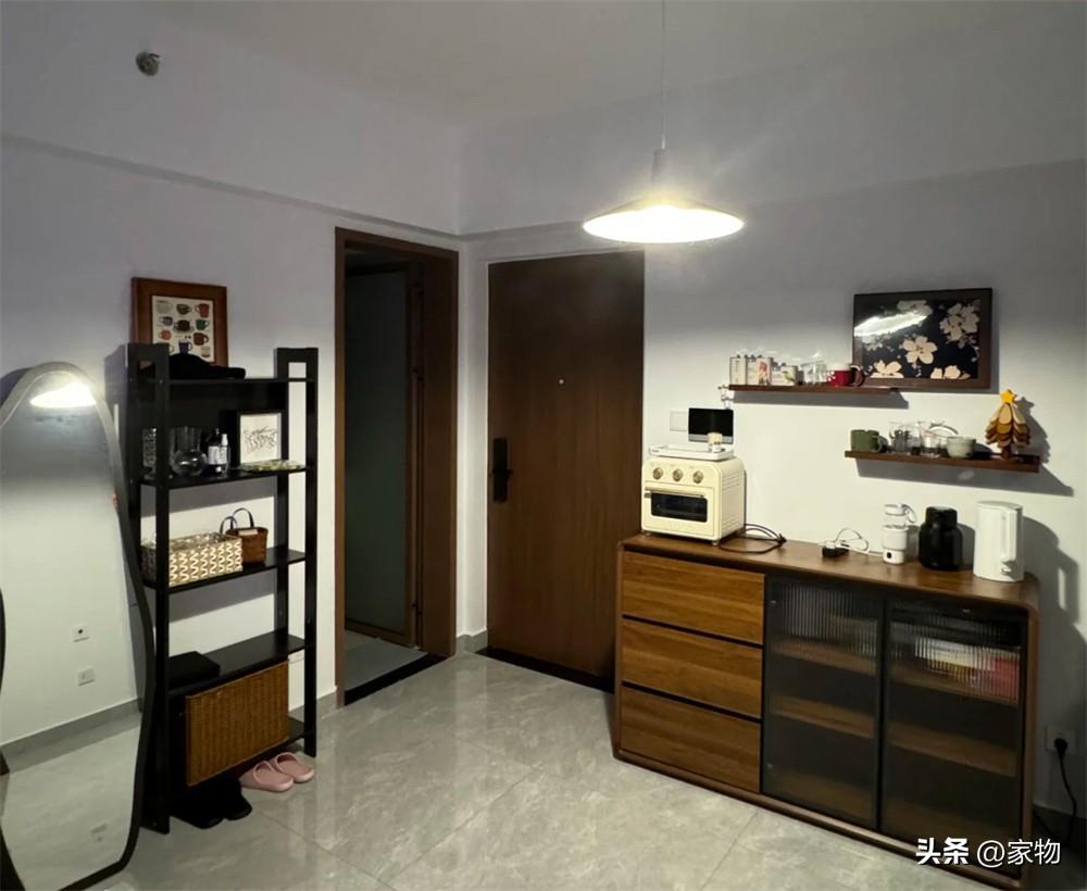 同時,櫃子也可以放小烤箱、燒水壺,同時承擔餐邊櫃的功能,搭配旁邊一臺小冰箱,打造出融合玄關和餐廳的舒適空間。