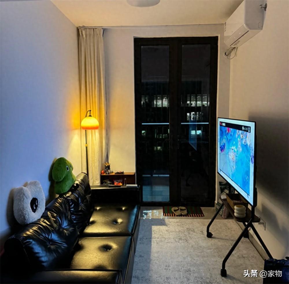 靠牆位置放上一張長沙發,另一邊則用支架電視代替壁掛和電視櫃,反而能在不佔地的同時,多出一個放遙控和機頂盒的小小置物架,實用性頗強。